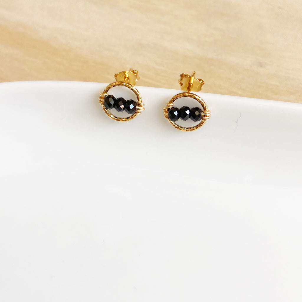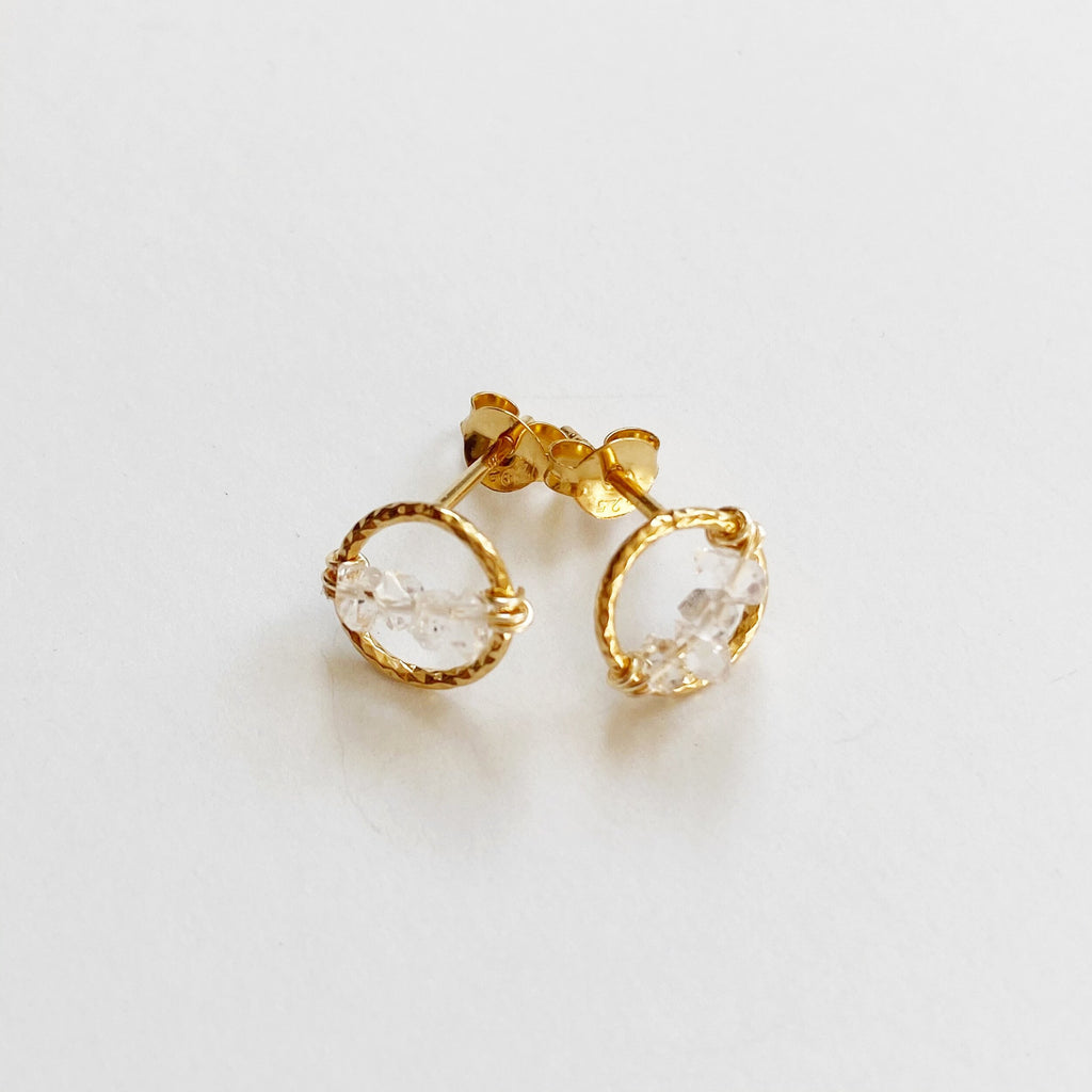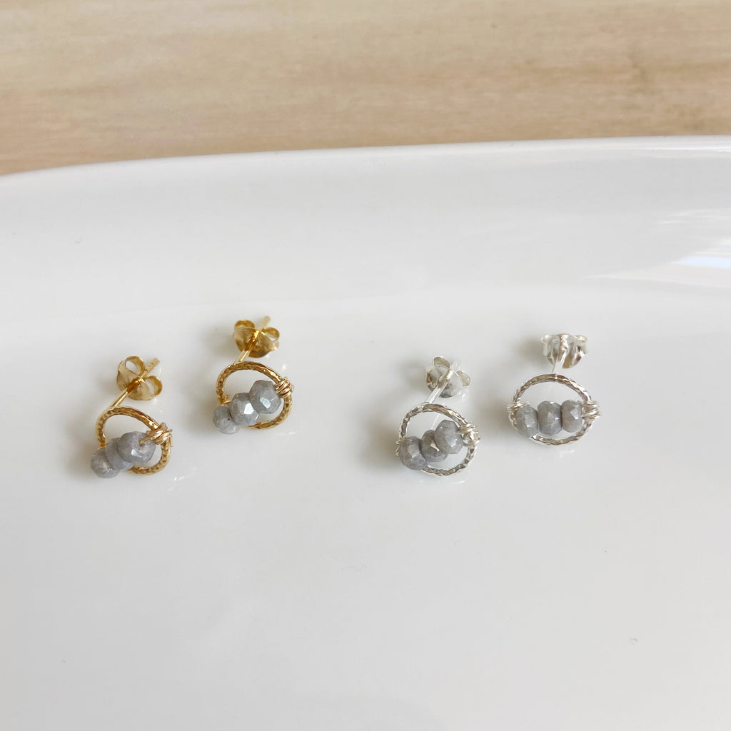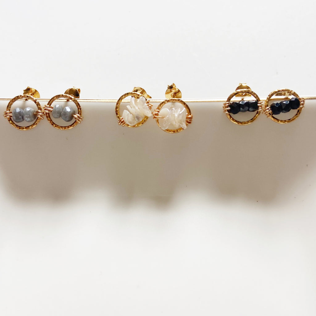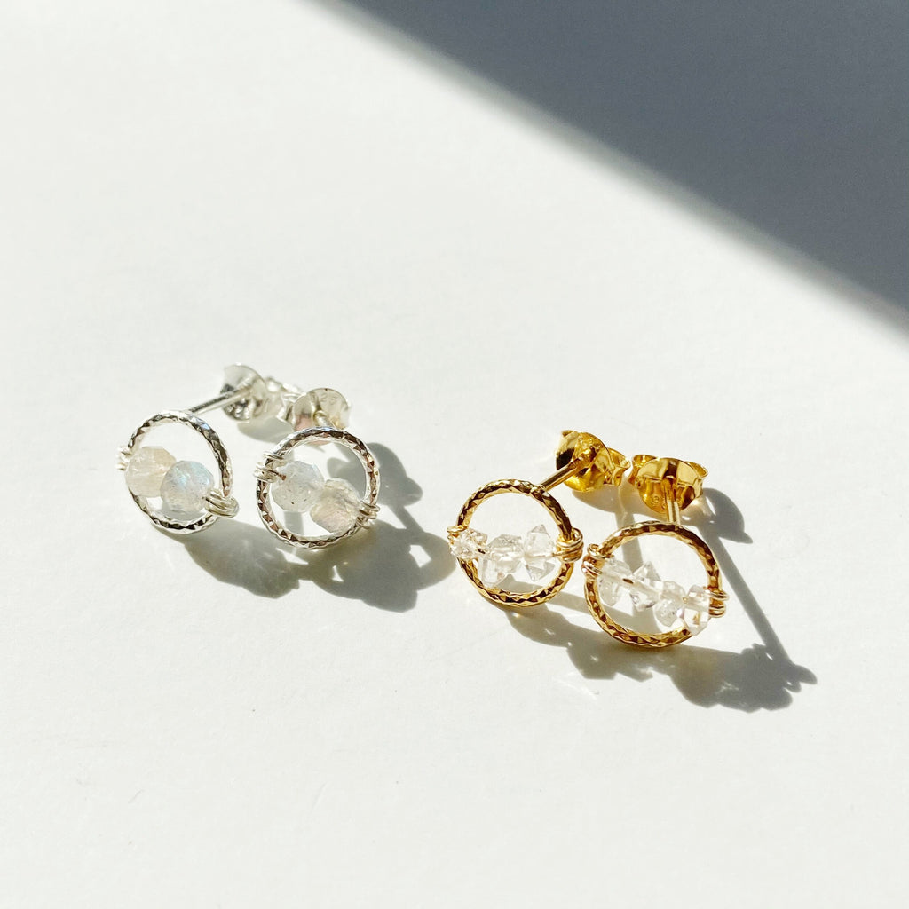 The perfect everyday earring is here! Tiny hammered gold or silver open circle studs are elevated with sparkle. A tiny segment of genuine gemstones are wrapped by hand across the opening. Wear them alone, or as second piercing with a larger earring in your first hole. Please note due to variations in size and shape of gemstones and Pearls, your pair of earrings may have a different number of stones than what is pictured here.