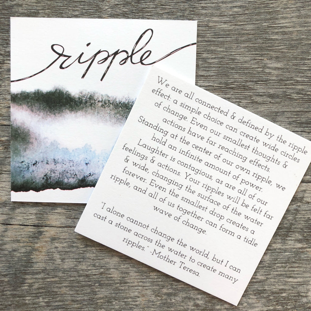 Inspired by the word “Ripple,” these pieces remind us of the power of small actions and the far reaching effects of our kindness. The earrings will be packaged with a 3.5 x 3.5 card featuring artwork and lettering of this powerful word, along with the full story of the piece.