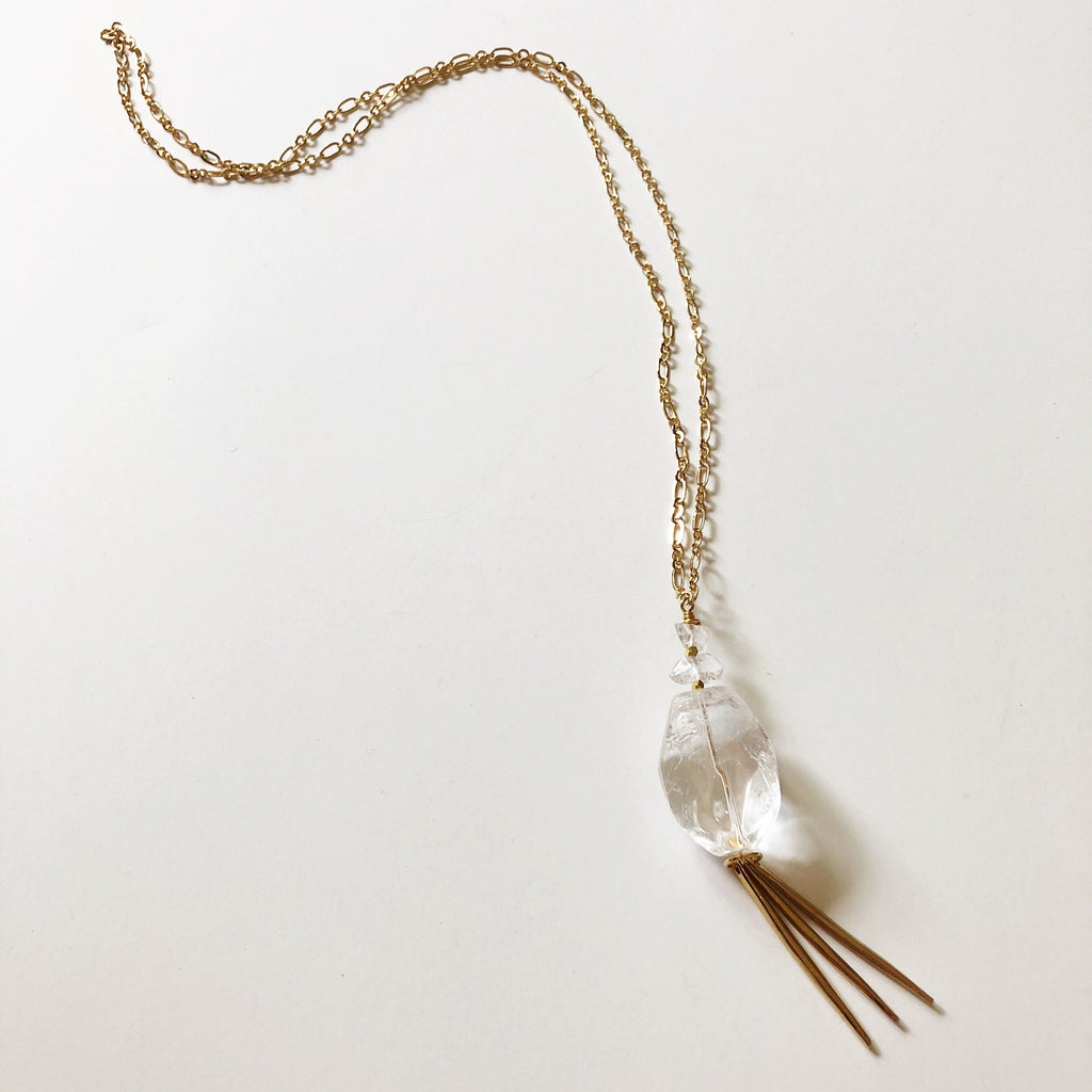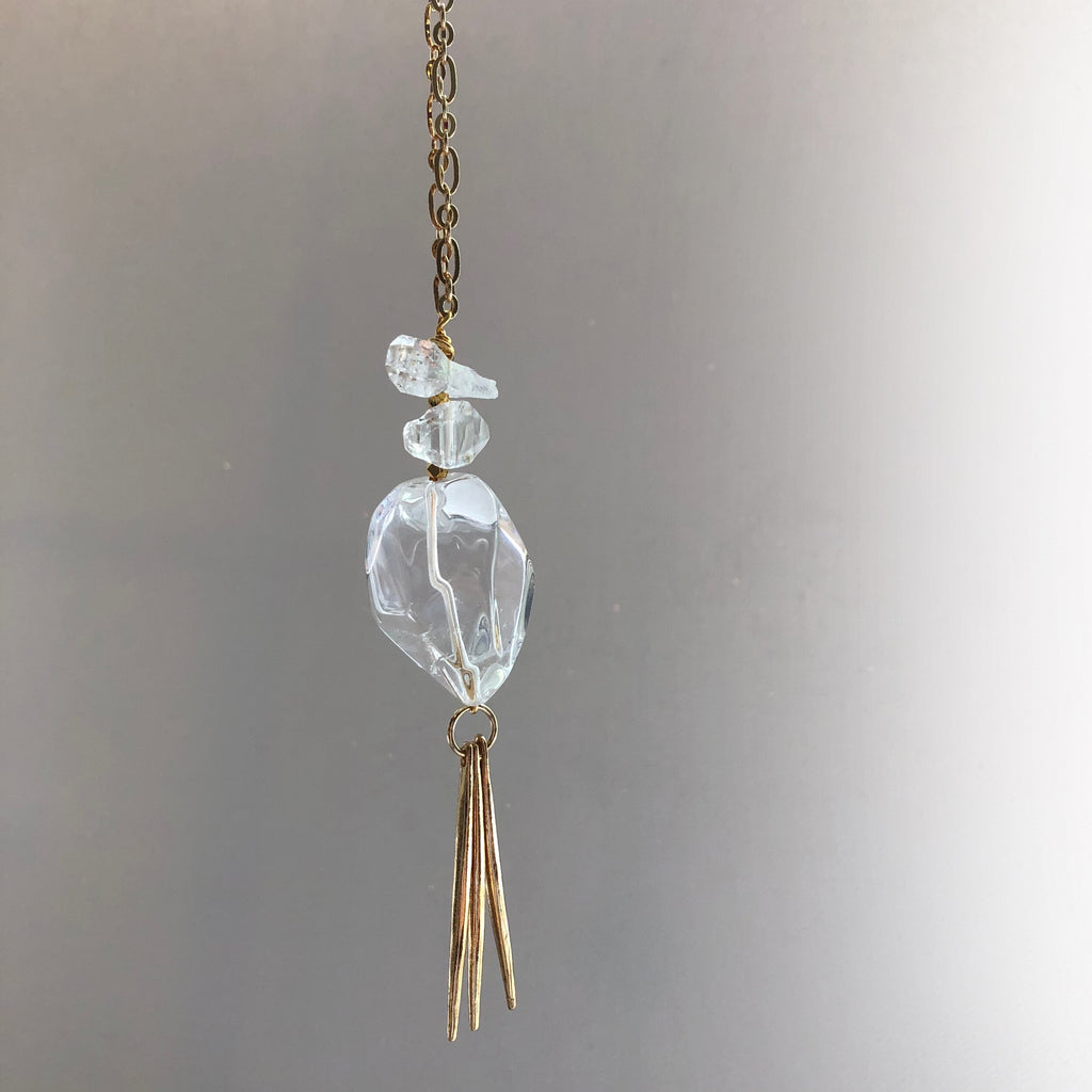 This necklace was inspired by the word “Ripple,” and the image of the ripple is mirrored in the design of this necklace. Rough cut Herkimer Diamonds build towards a large, smooth as glass, Clear Quartz nugget, and then the necklace finishes with a fan of golden spears.