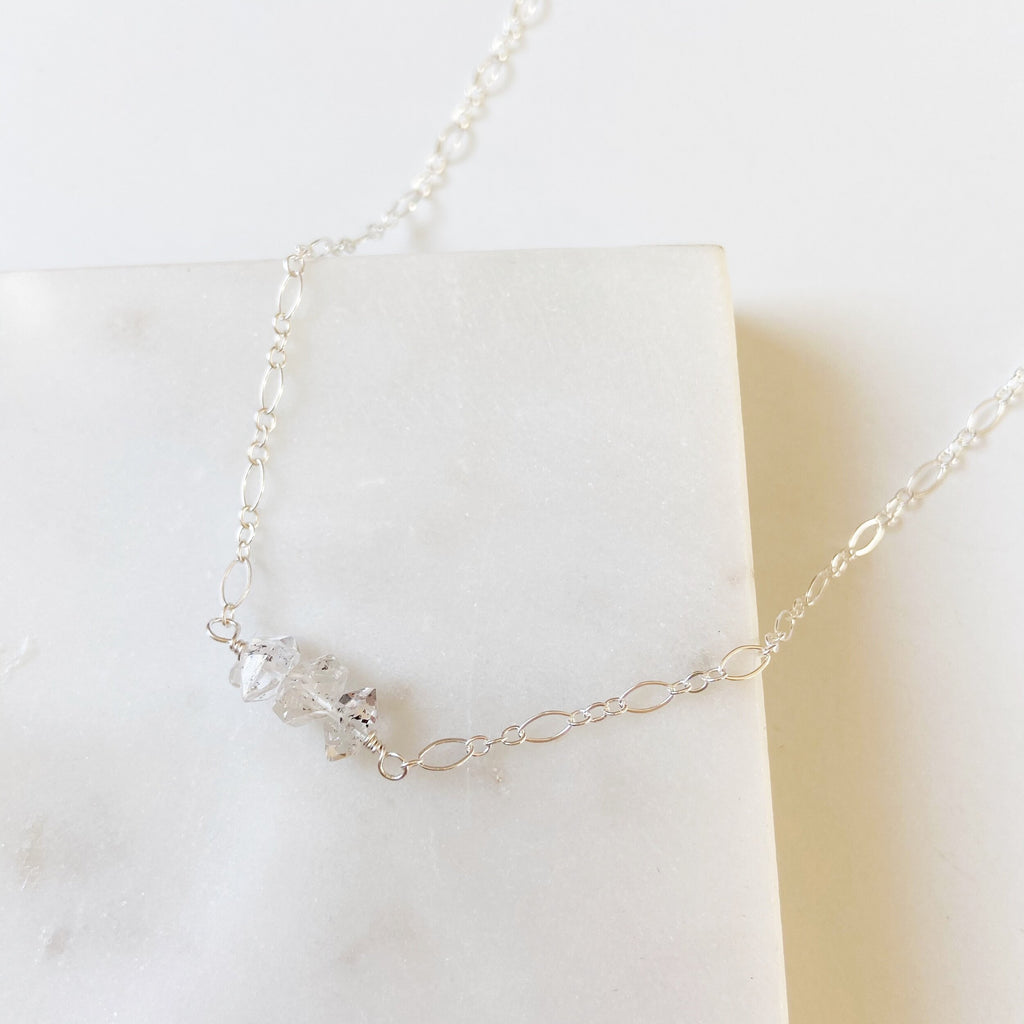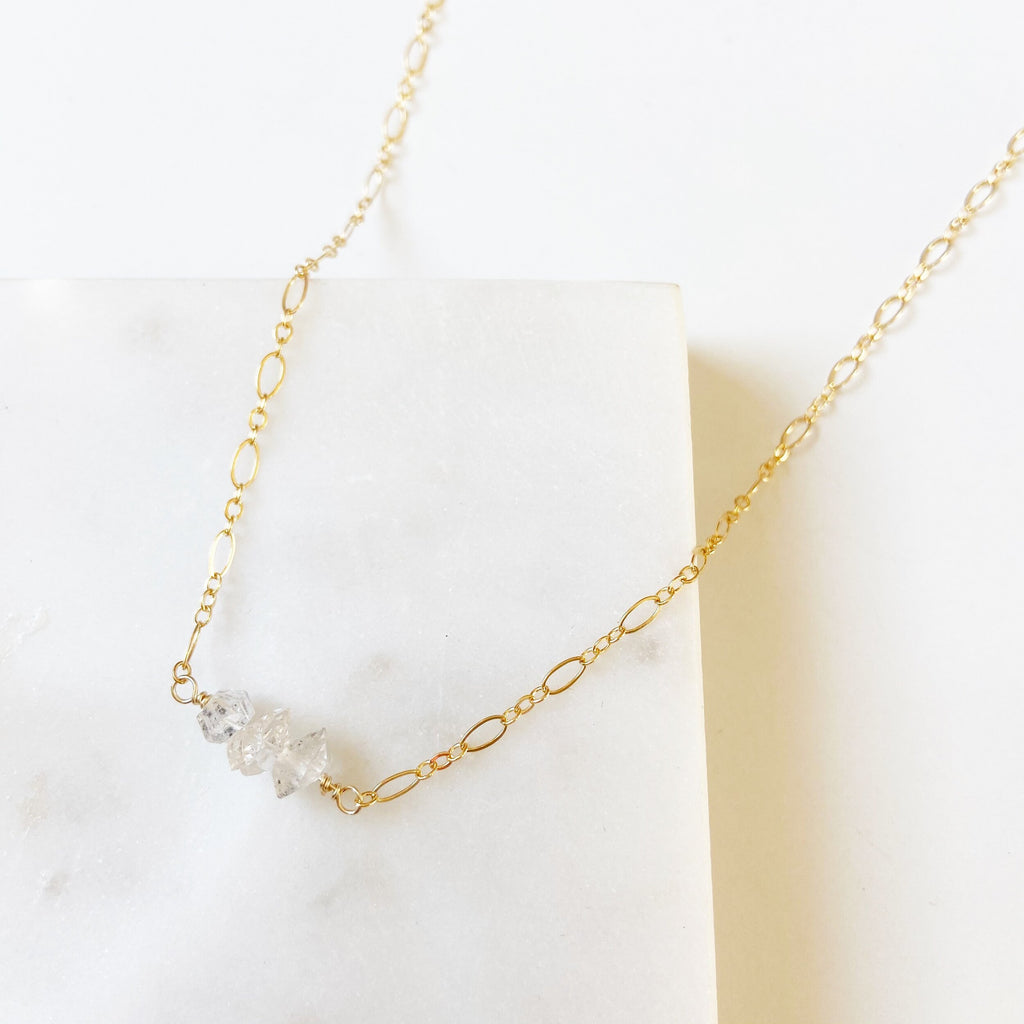 A trio of dainty raw Herkimer Diamonds rest at the throat in this simple yet elegant choker length necklace. These gemstones are clear with tiny flecks of black natural mineral inclusions throughout- making each stone special and unique.