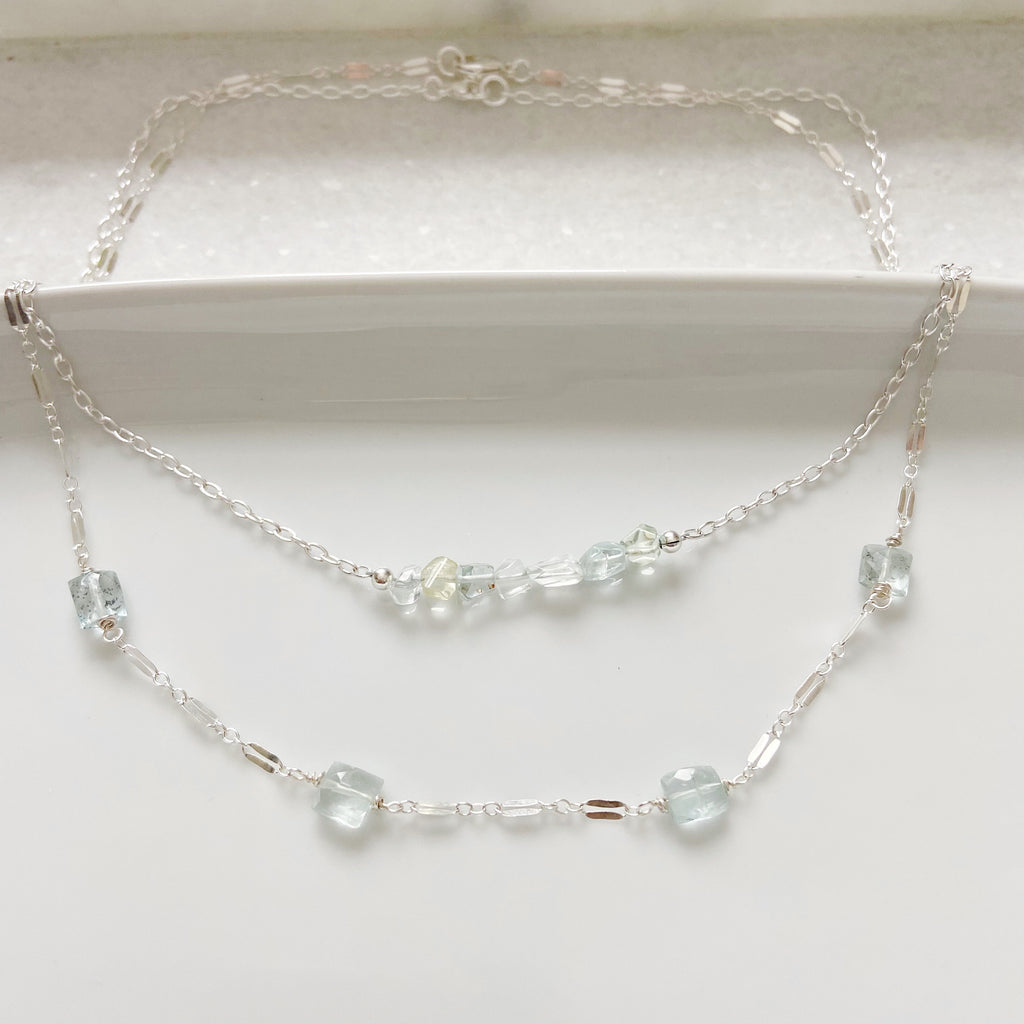 Clear aquamarine nuggets are thoughtfully spaced along a delicate sterling silver or gold filled chain.