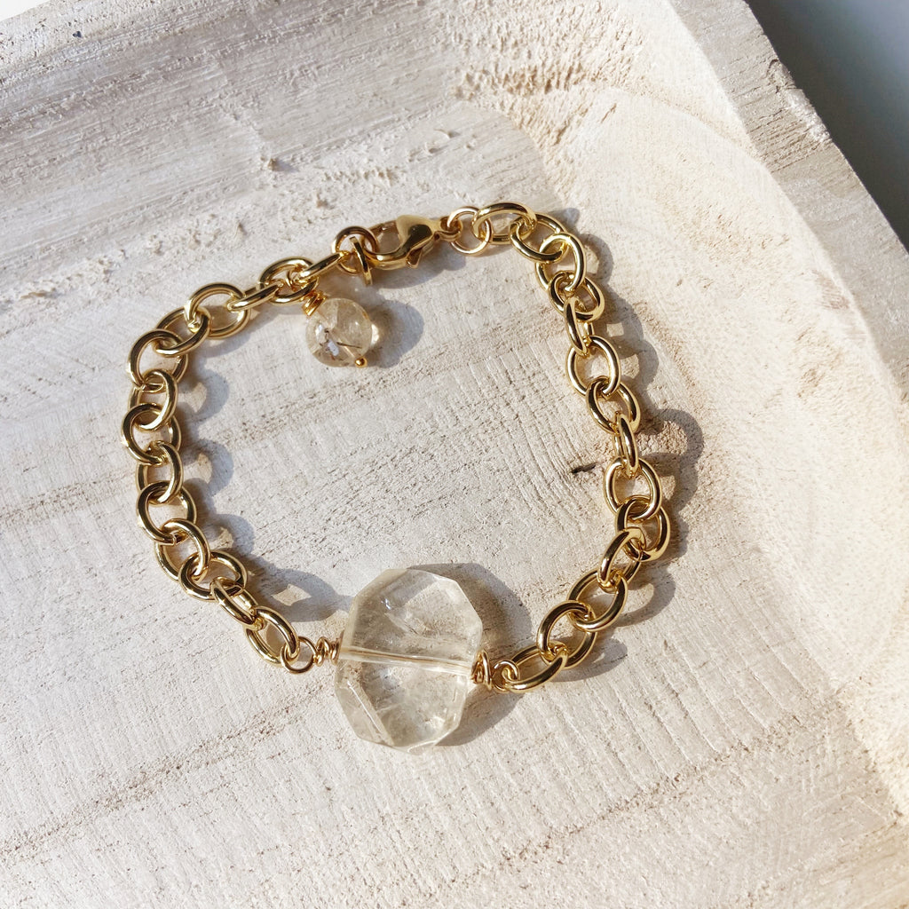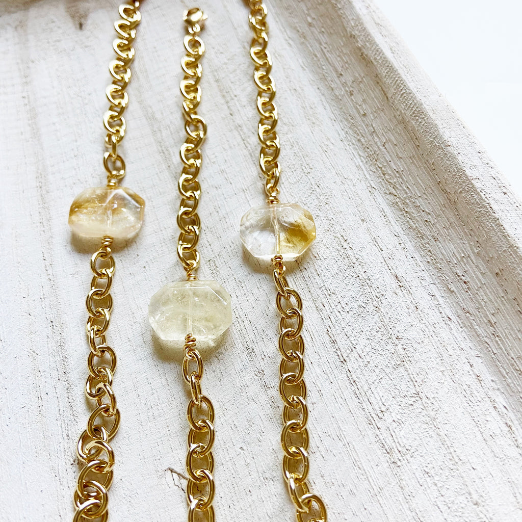 A single warm golden flat Citrine gemstone marks the center of this chunky gold chain link bracelet. When the sun hits this stone it seems to glow from within.