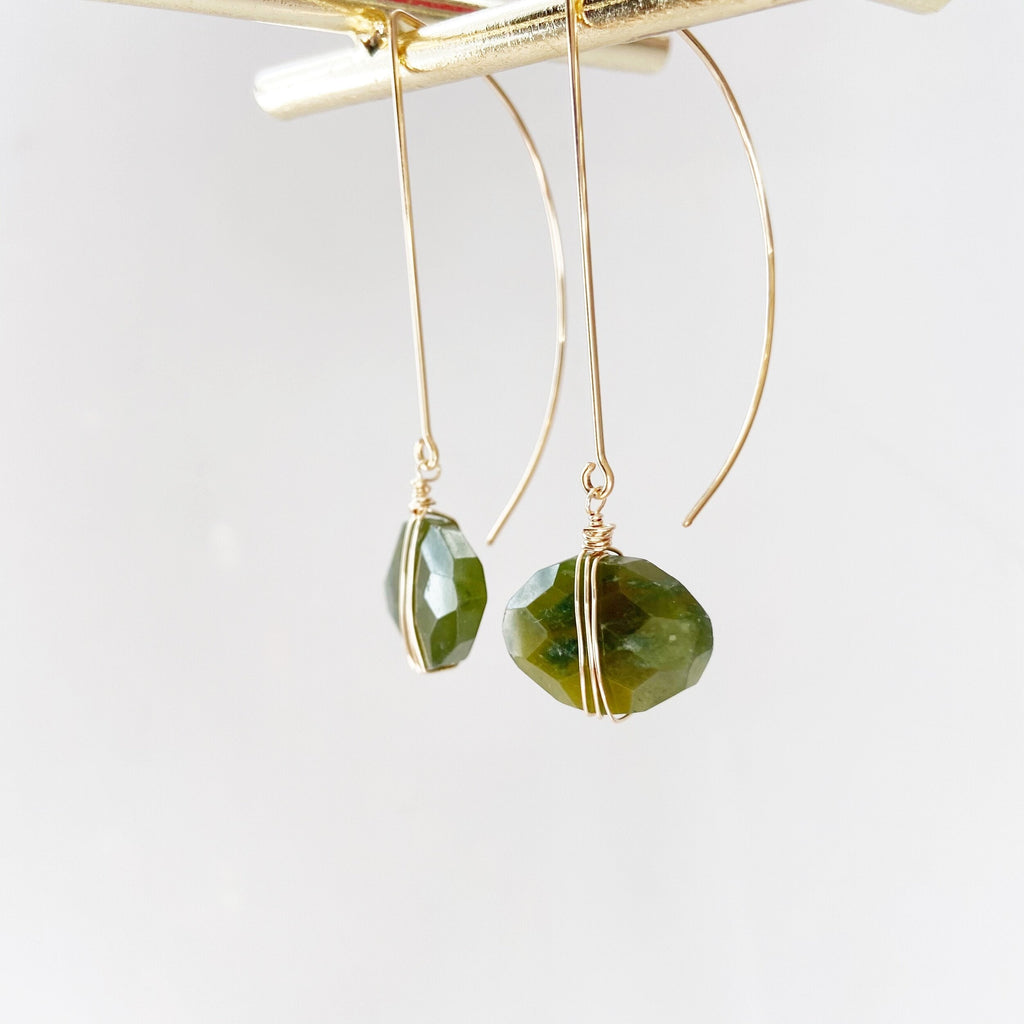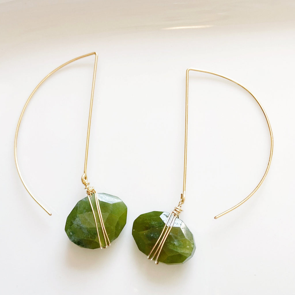A faceted oval shaped moss green vessonite gemstone dangles from a gold ear wire in the unique shape of a half moon. Their unique shape make them an eye catching statement piece in a color that is bright and earthy