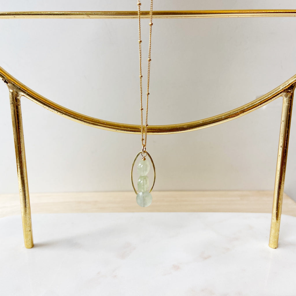 Faceted purple (cacoxenite) or pale green (pyrinite) coin gemstones layer over an oval charm on this gold filled satellite chain necklace.