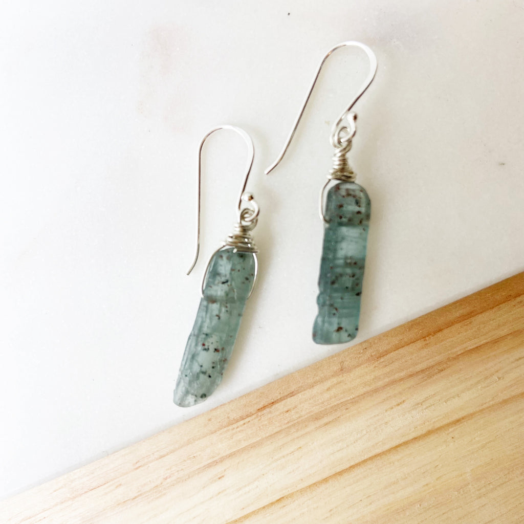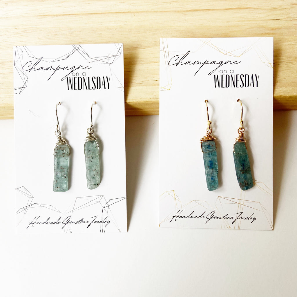 Raw translucent kyanite slices are artfully wire wrapped to dangle from classic gold filled or sterling silver ear wires. Each pair of earrings is unique and one of a kind due to the varied nature of these stones, and may vary slightly in size or shape from what is pictured here.