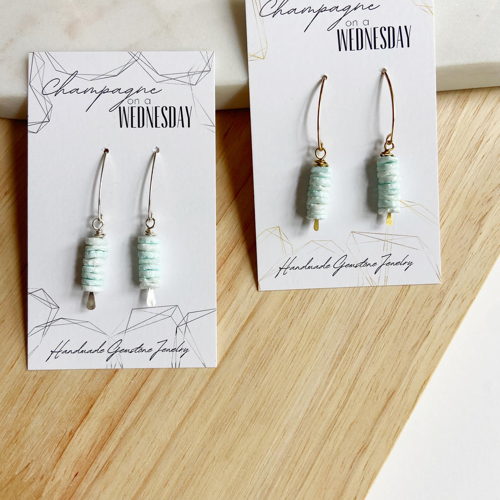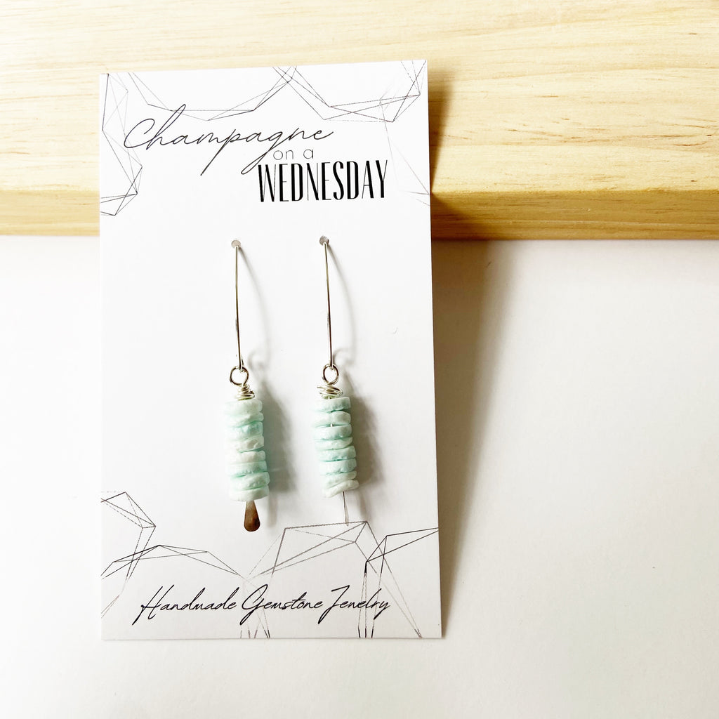 A stack of rough pale turquoise rondelles dangle from a dainty pointed sterling silver or gold filled ear wire. The color of the stones may vary from pale turquoise to almost white.