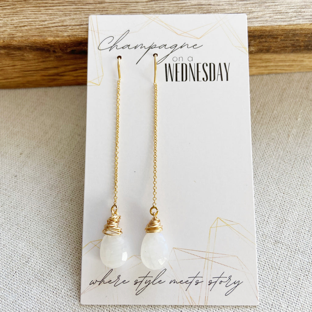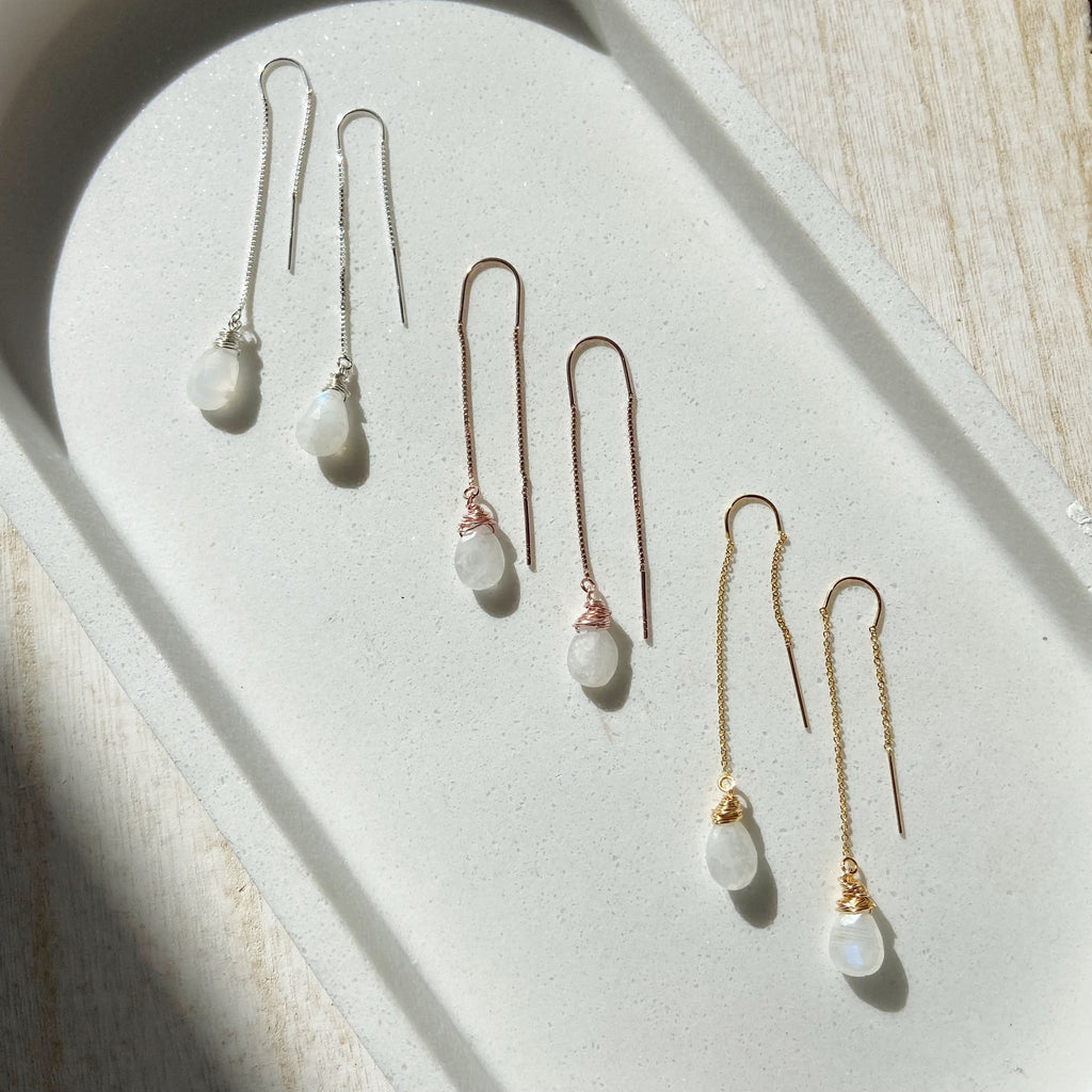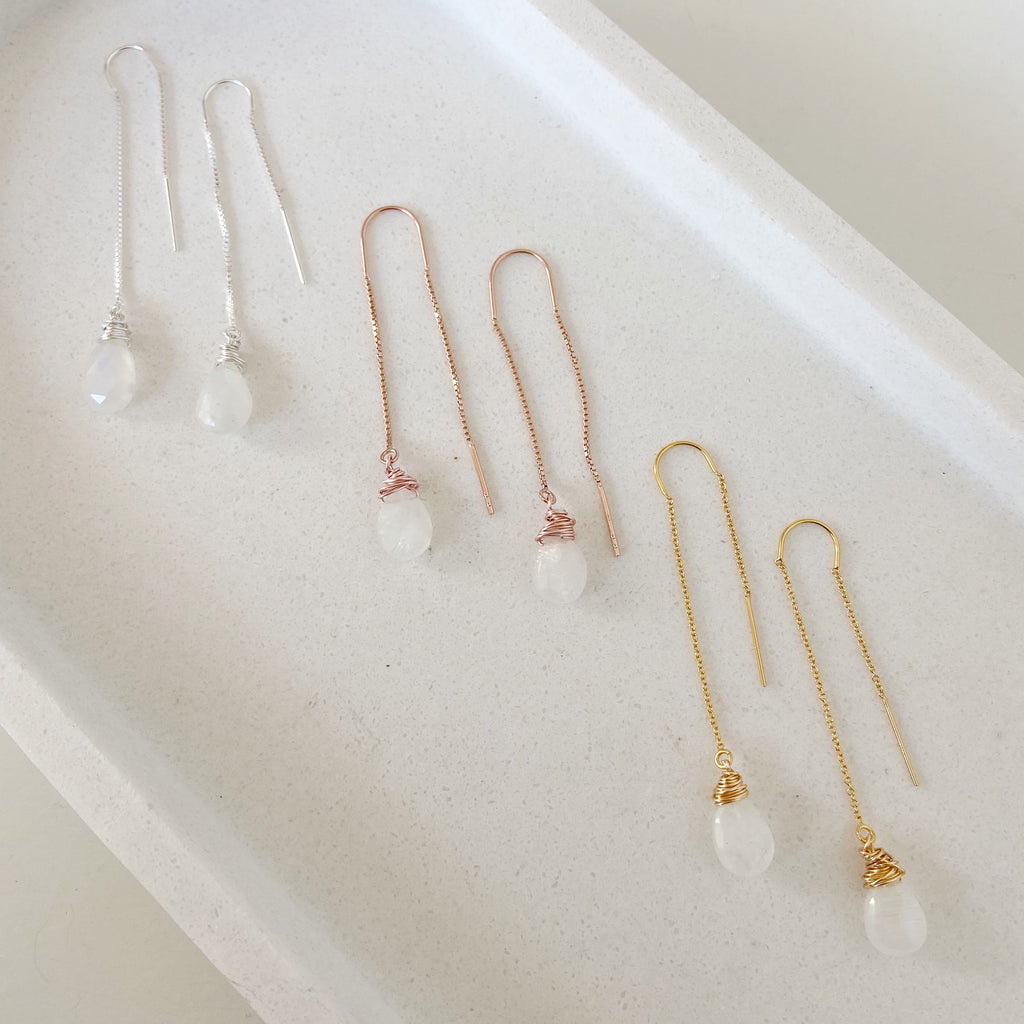 Moonstone Teardrop Threader Earrings in Gold, Silver, or Rose Gold