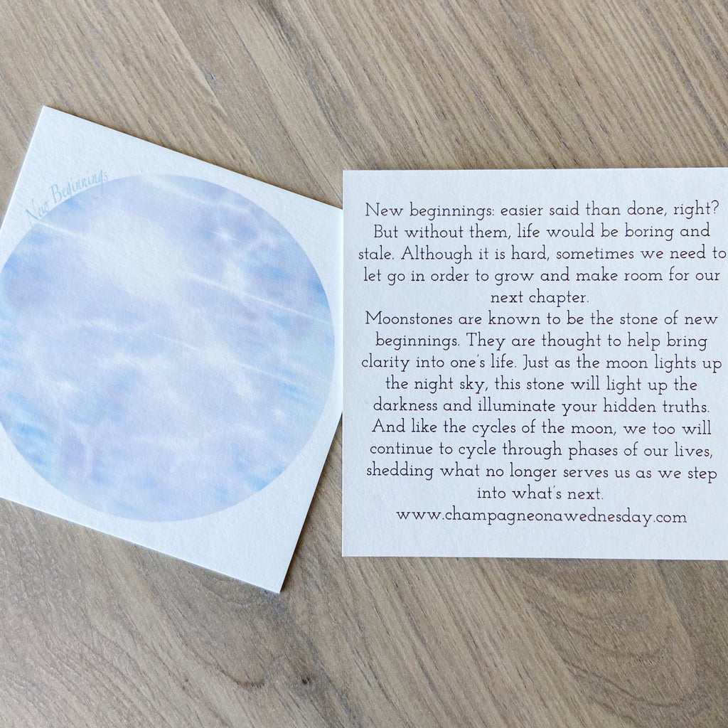 Every piece in the New Beginnings Moonstone Collection was designed to let this powerful and beautiful gemstone take center stage. Moonstone are known for their ability to enhance intuition, clarity, and wisdom to those who wear it, making it the perfect stone to represent the message of New Beginnings. This piece of genuine moonstone jewelry will be packaged with a 3.5 x 3.5 card, featuring original artwork inspired by the subtle pastel rainbow that is alive within each moonstone. The back of the card includes an inspiring message about embracing growth, letting go of the past, and welcoming the fresh start of a new beginning.