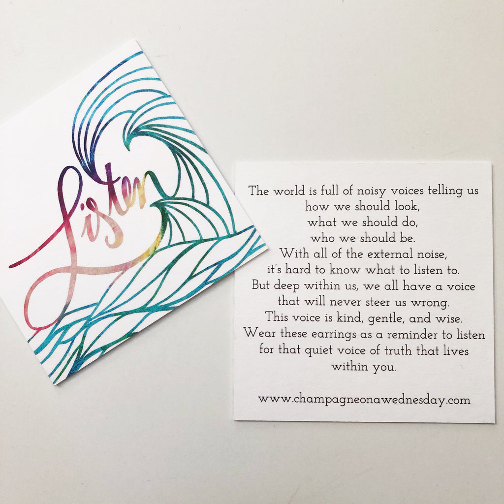 These earrings were inspired by the word "Listen," and are meant to remind you that even in a noisy world, you have a quiet voice full of wisdom within you. Whenever the chatter all around you seems to be too much, let these earrings be your touch point to tune back into what you know to be true.