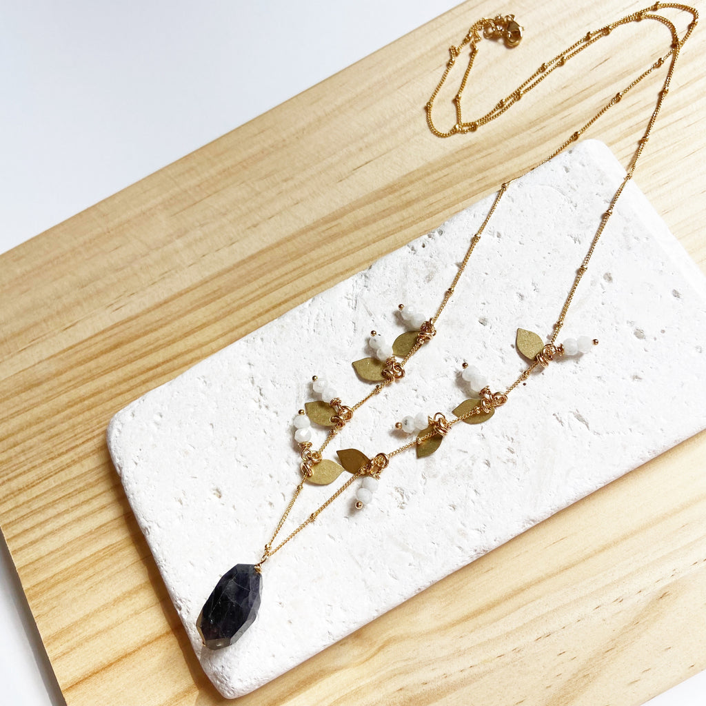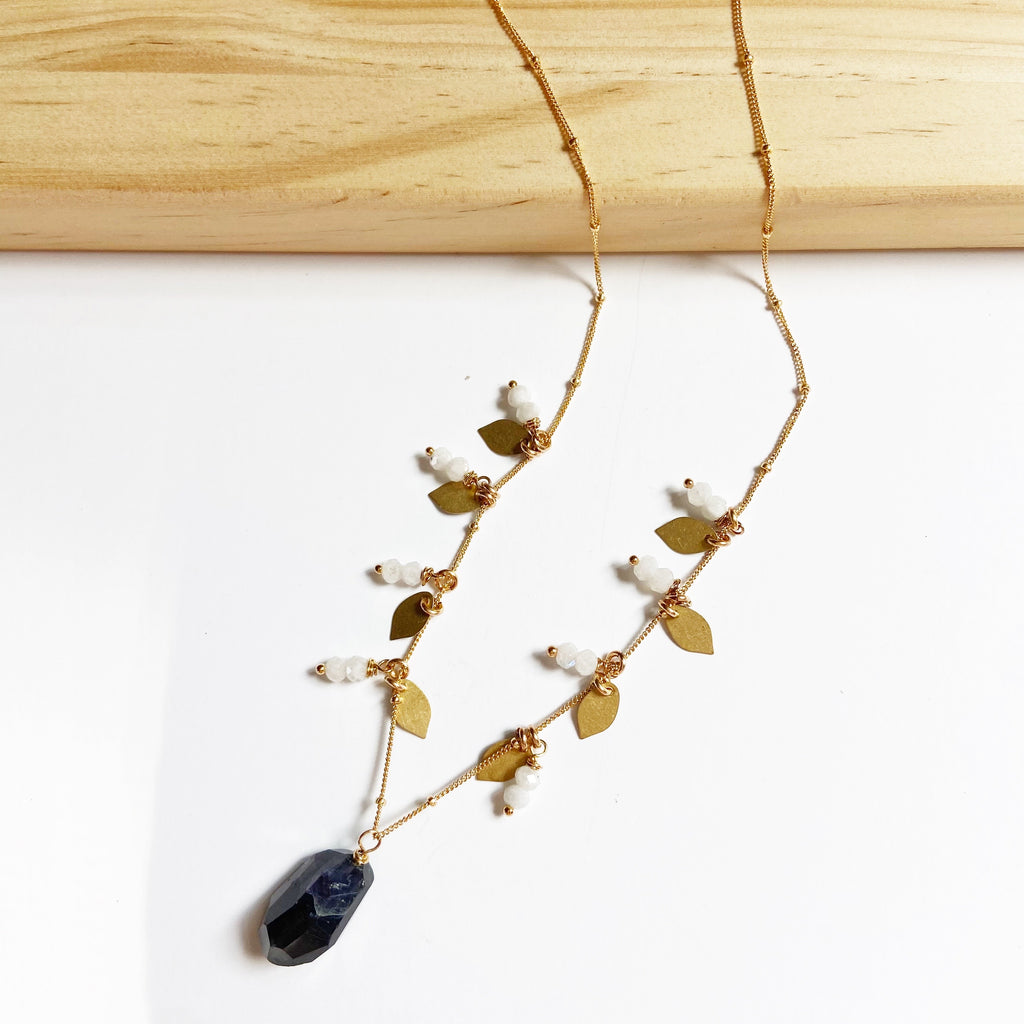 Luxe Moonstone and Kyanite Leaf Necklace (26 inches)