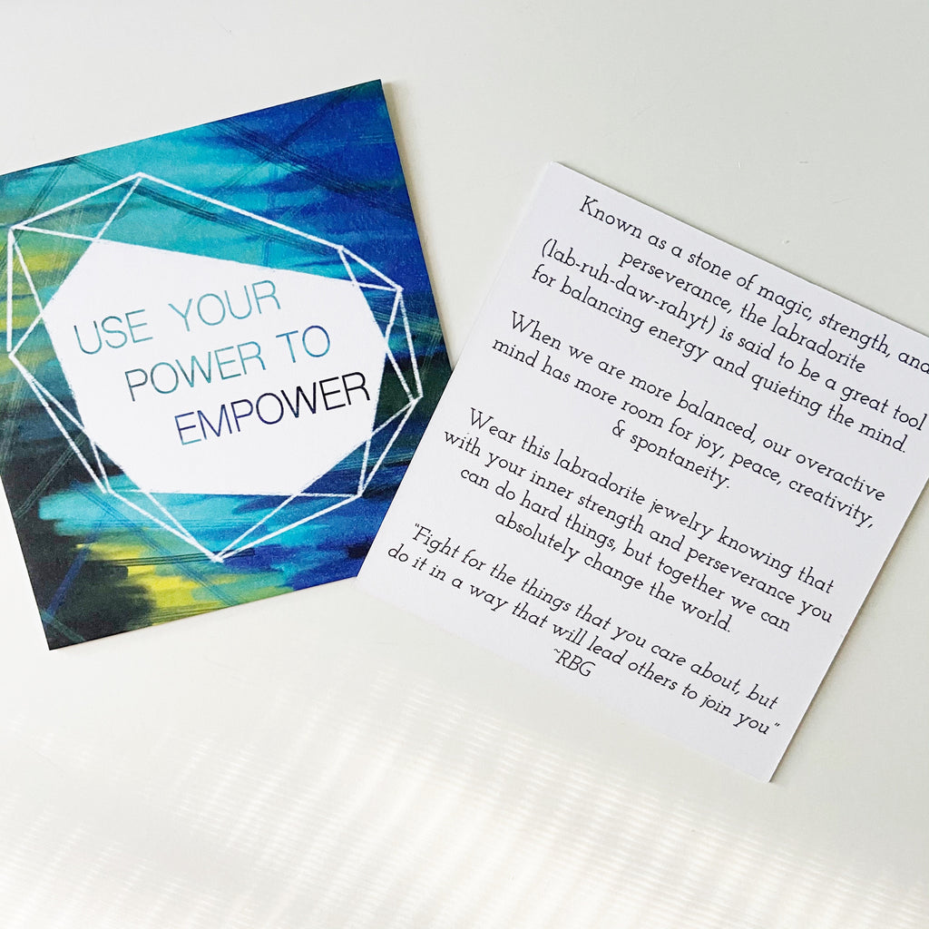 This necklace will be packaged with a 3.5 x 3.5 inch artwork card featuring the labradorite themed original artwork of this collection, showcasing the phrase, "Use Your Power to Empower."