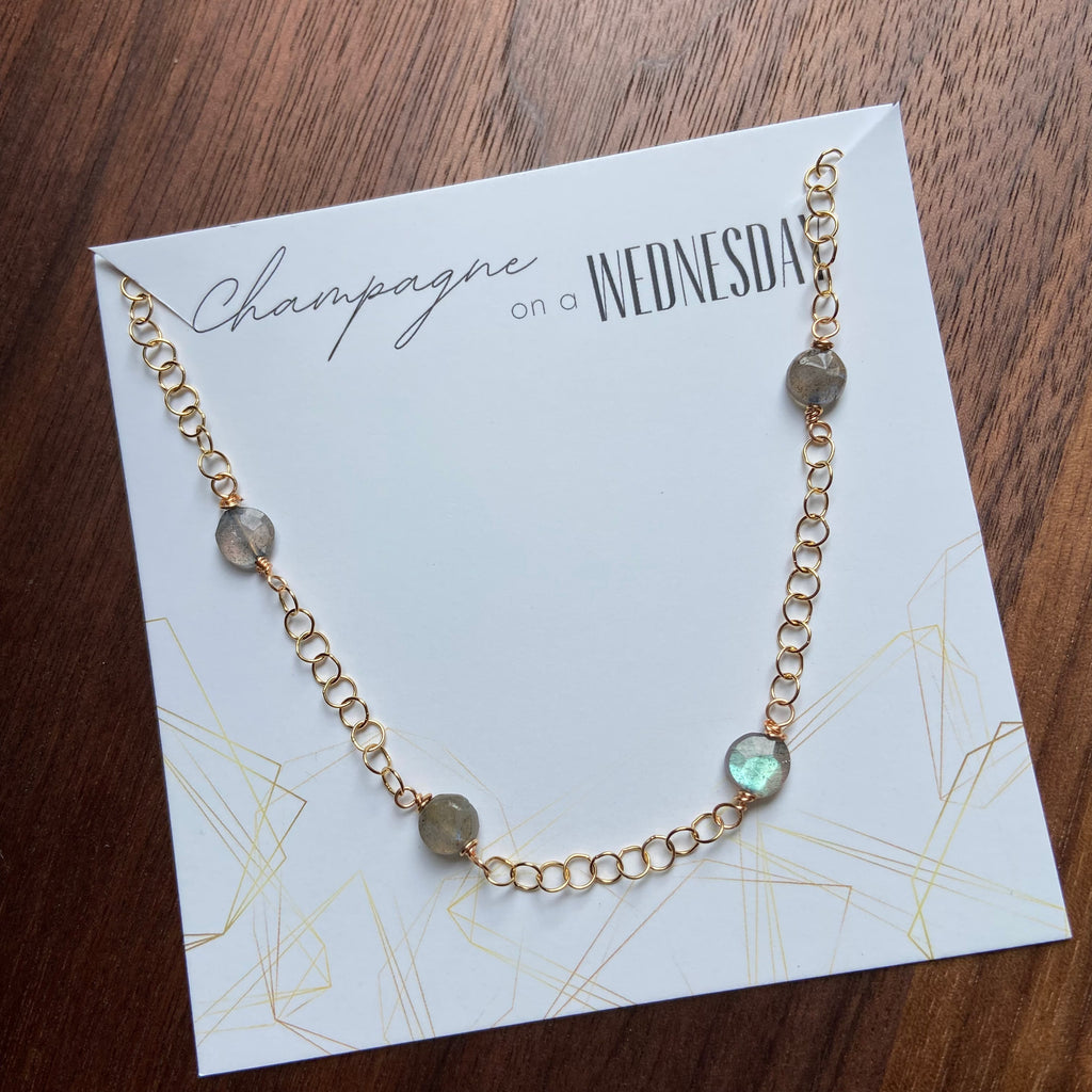 Dottie- Labradorite Coin Necklace or bracelet in Silver and Gold (16 inches)