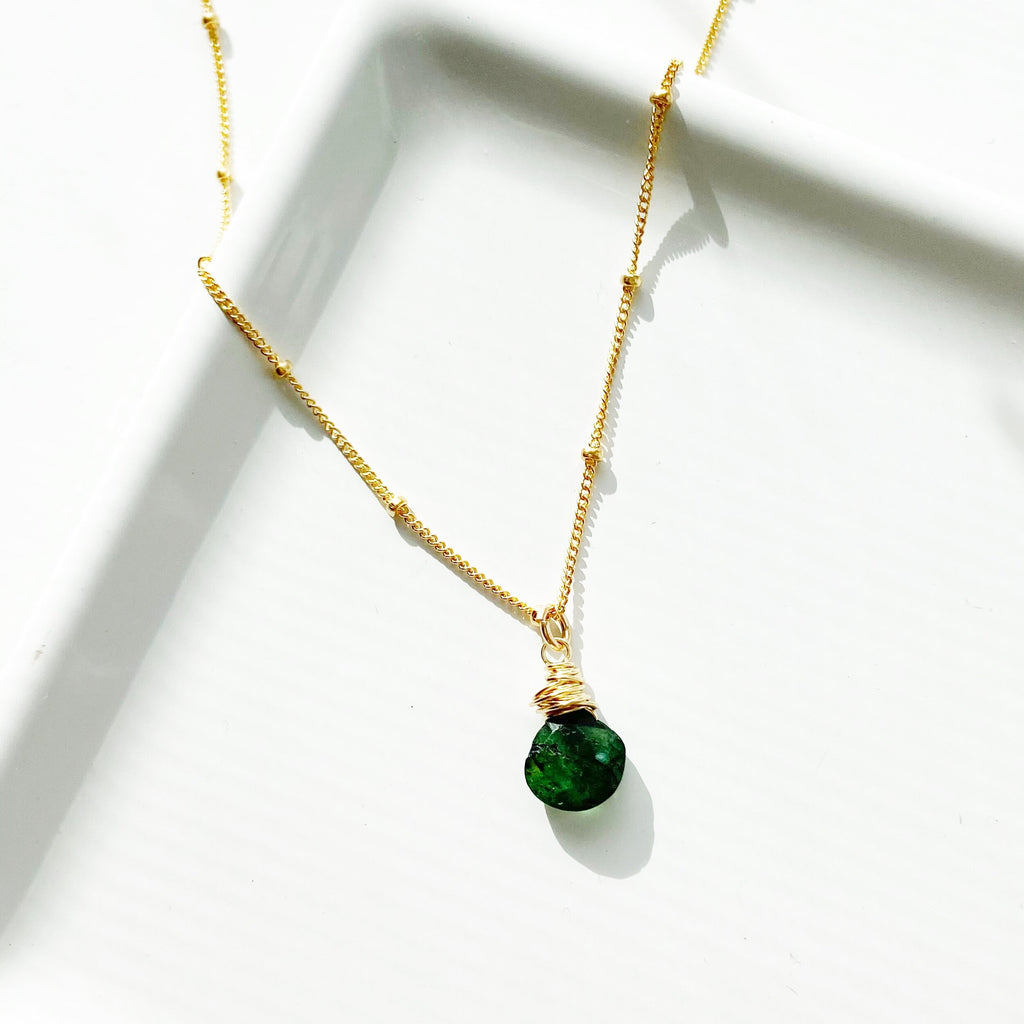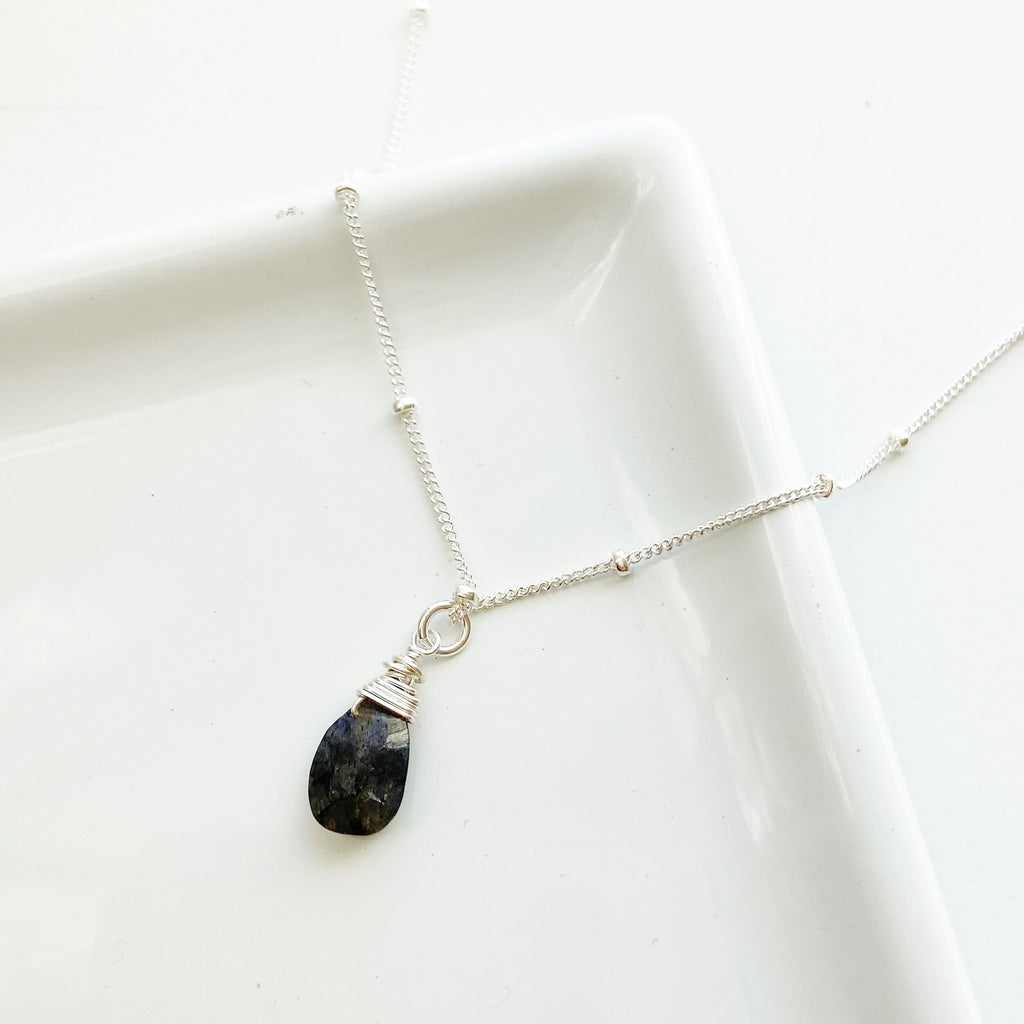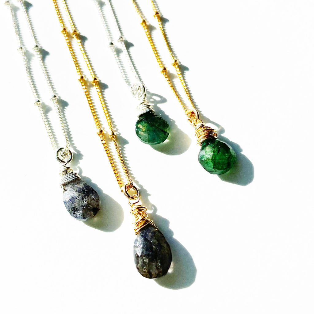 A single briolette wrapped labradorite moves freely across a dainty satellite chain in this delicate and classic necklace. Generally known for their ambiguously blue/green/grey color, these genuine labradorite gemstone have been treated to become either a bold emerald green, or a deep navy blue. This coloring of these stones is permanent and will not fade or transfer, meant only to enhance the natural beauty of the gemstone.