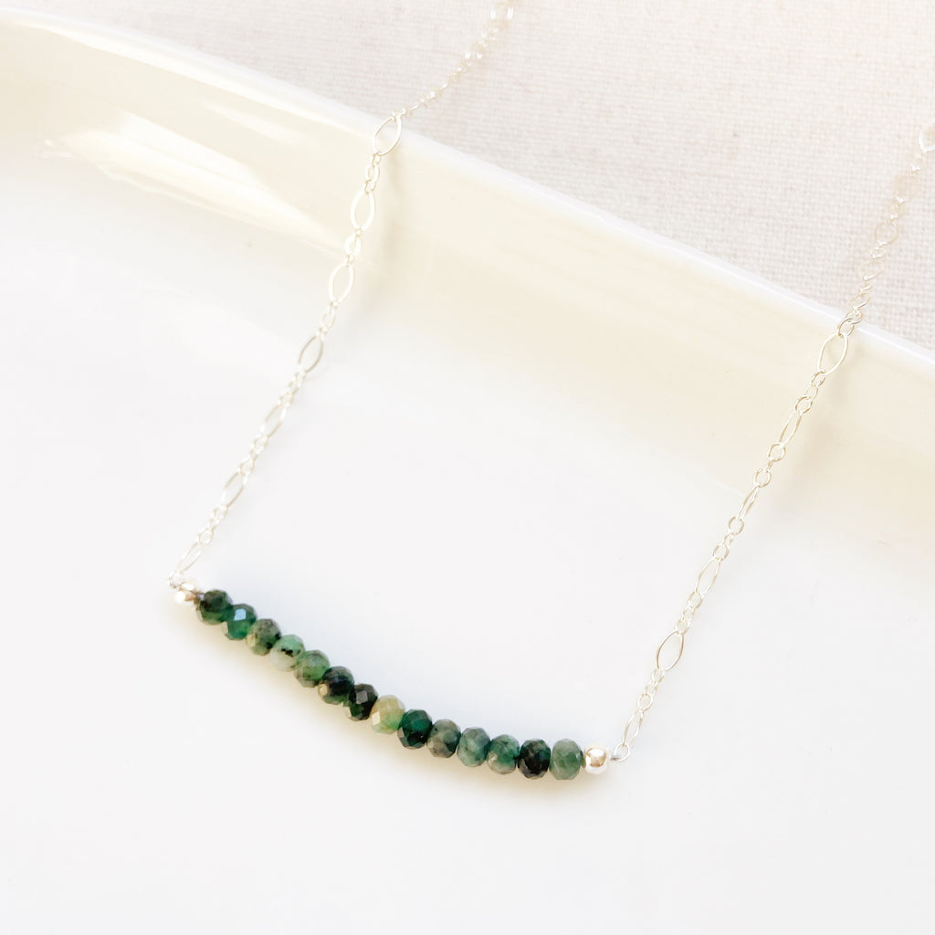 Emerald comes in a variety of hues and opacity, a few examples are shown here. Build a piece using just emerald, or mix different stones to create a one of a kind piece that represents important people or dates in your life.