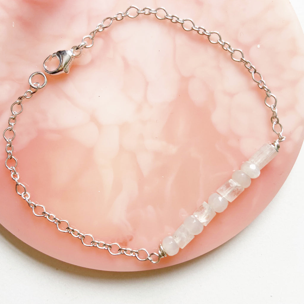 A sparkling segment of intricate faceted moonstones sit atop your wrist, flanked by a delicate selection of gold or silver chain. Perfect to wear alone or layer with your other favorite bracelets, this classic moonstone bracelet will easily become a wardrobe staple.