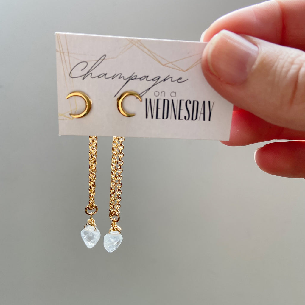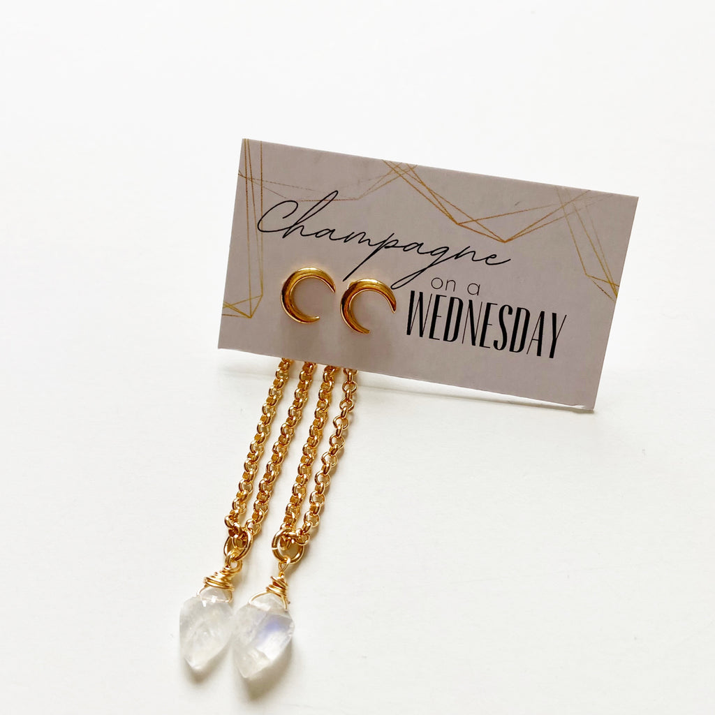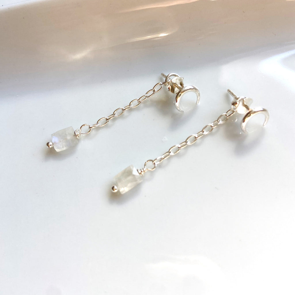 A simple gold moon stud is made into a unique work of art with a beautiful shield shaped moonstone dangling from a loop of chain on the back of the earring.