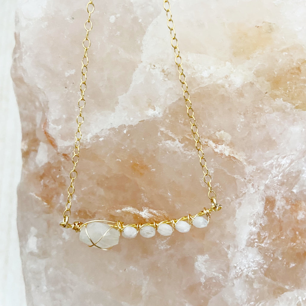 A selection of reflective and faceted moonstones are wire wrapped artfully along a hammered crescent centerpiece. This beautiful and unique piece will rest just below your collarbone, held in place with delicate chain. Size and shapes of moonstones may vary from Necklace to necklace.