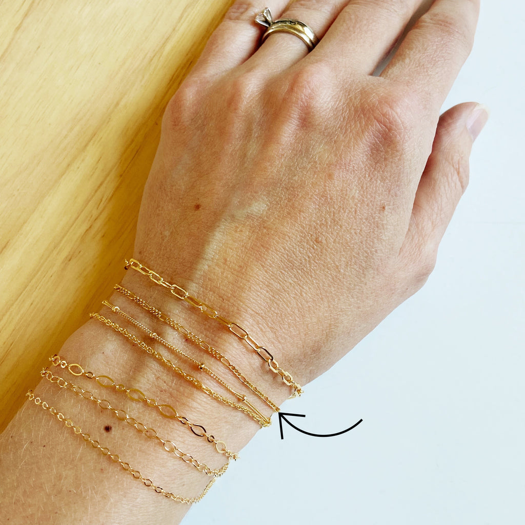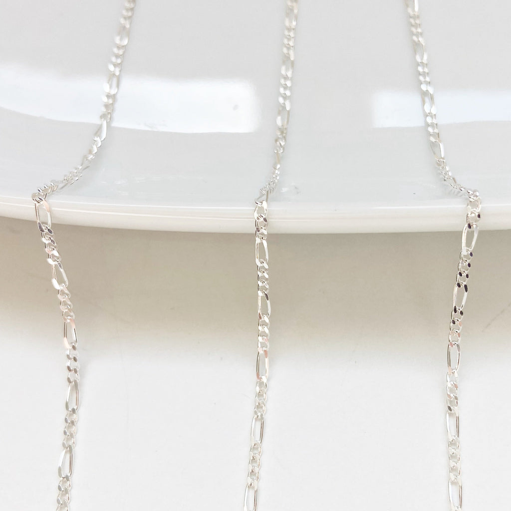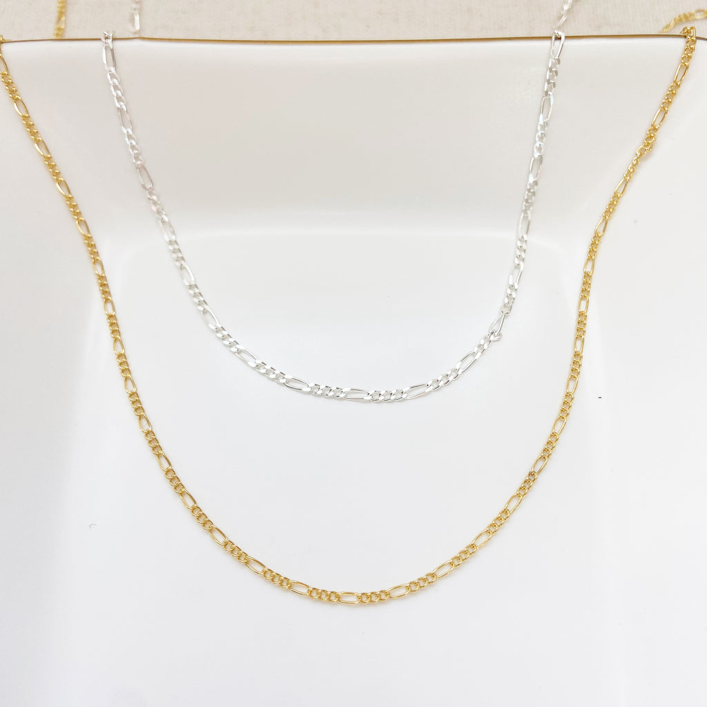 This trendy figaro style chain is perfect for layering, or to wear alone as a simple, elegant, everyday accessory. It alternated segments of long and short links in a tight woven flat chain style. This chain is used in our floating gemstone necklace, shown in the last photo for reference.