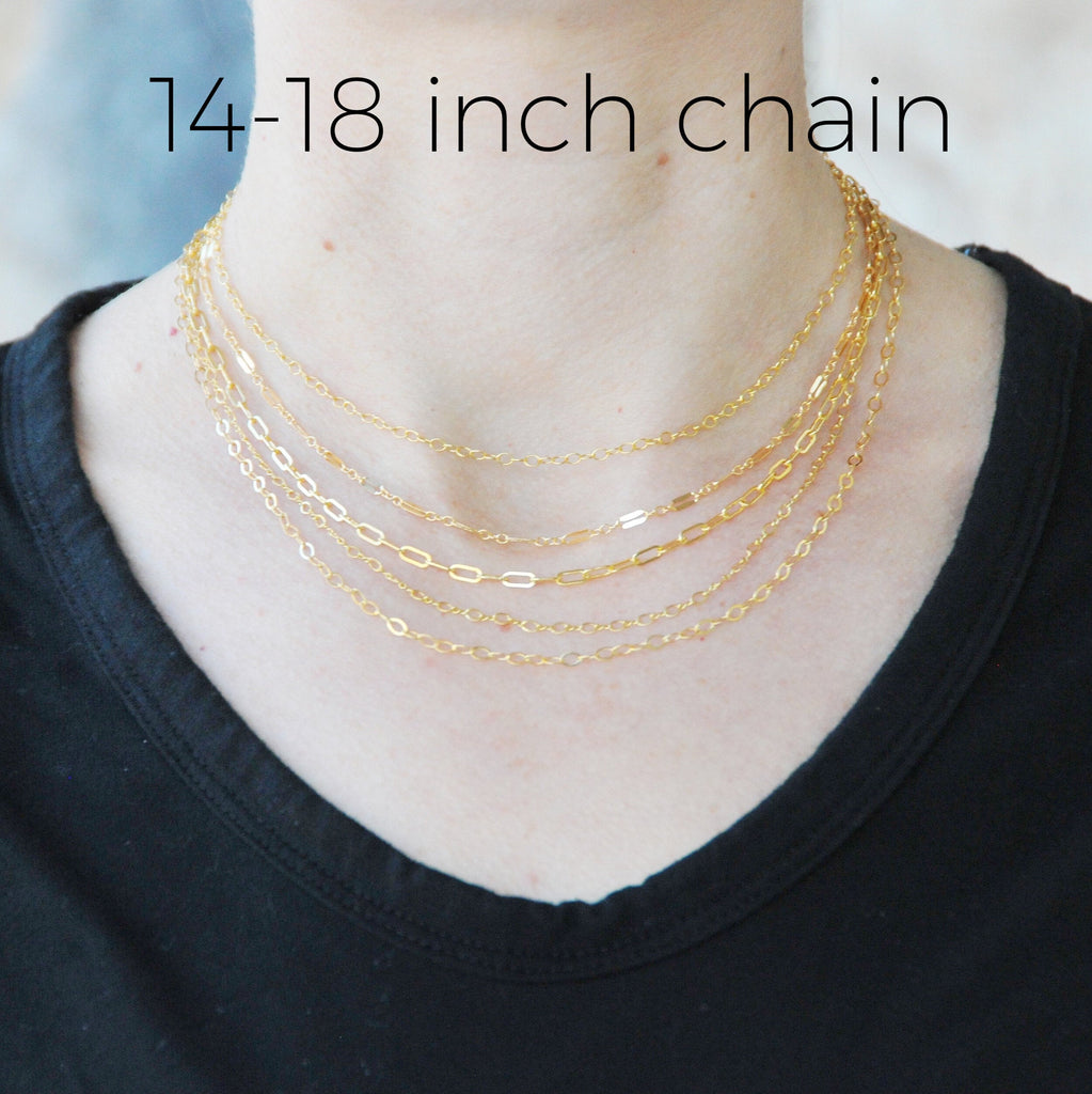See photos for length examples of common necklace lengths, or measure your favorite necklace at home. Please note that a plain chain necklace without a charm or pendant will rest differently on your neck than a chain weighted down with a pendant. Measure easily for a bracelet or anklet by wrapping a piece of string to the desired tightness, marking it, and then measuring the string. For half or quarter inch exact sizes, please order the closest size down and include a note a checkout with desired measurements.