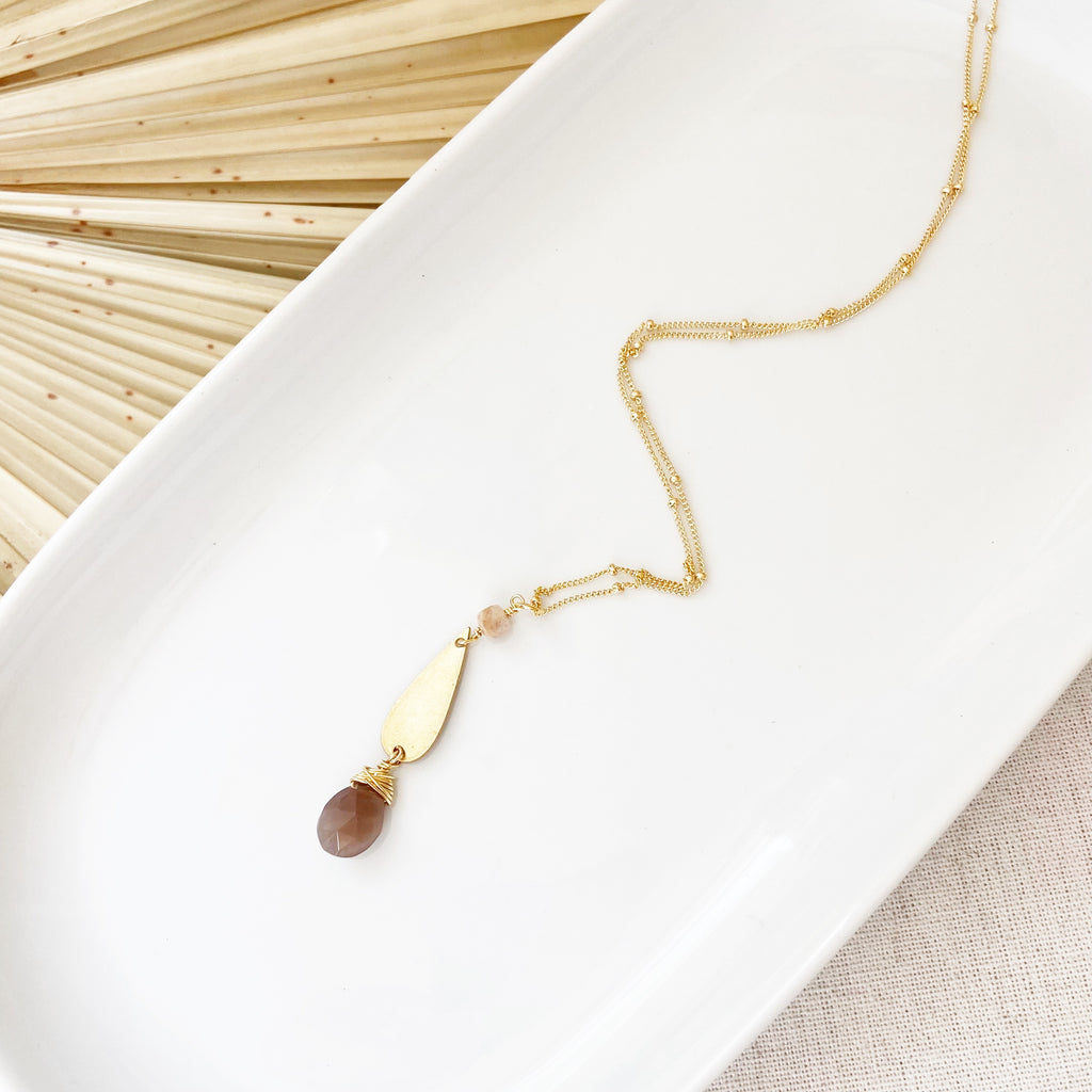 Teardrop Luxe Gold Long Charm Necklace in Chocolate Moonstone or Kyanite