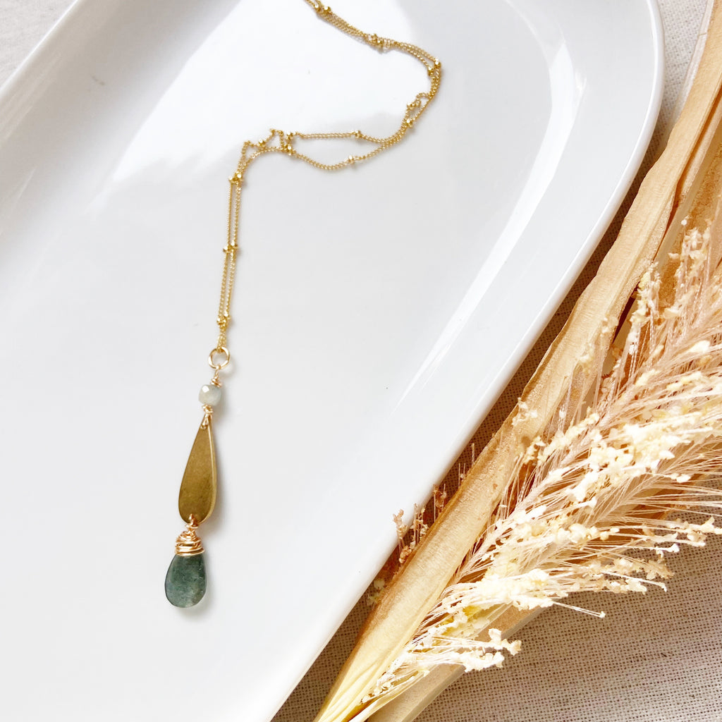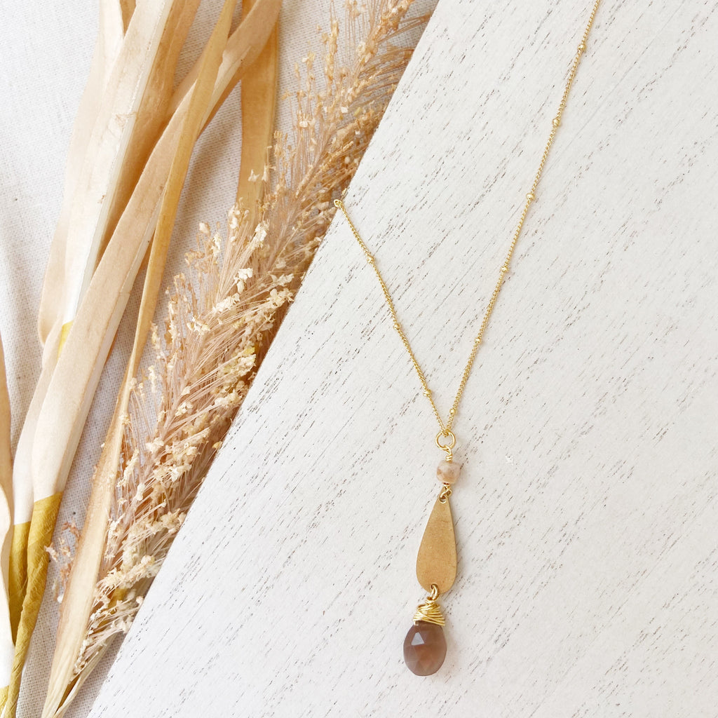 A single warm and smokey toned chocolate moonstone teardrop or greenish blue kyanite teardrop is briolette wrapped beneath a brushed gold teardrop charm, to create a necklace that is both simple and stunning.
