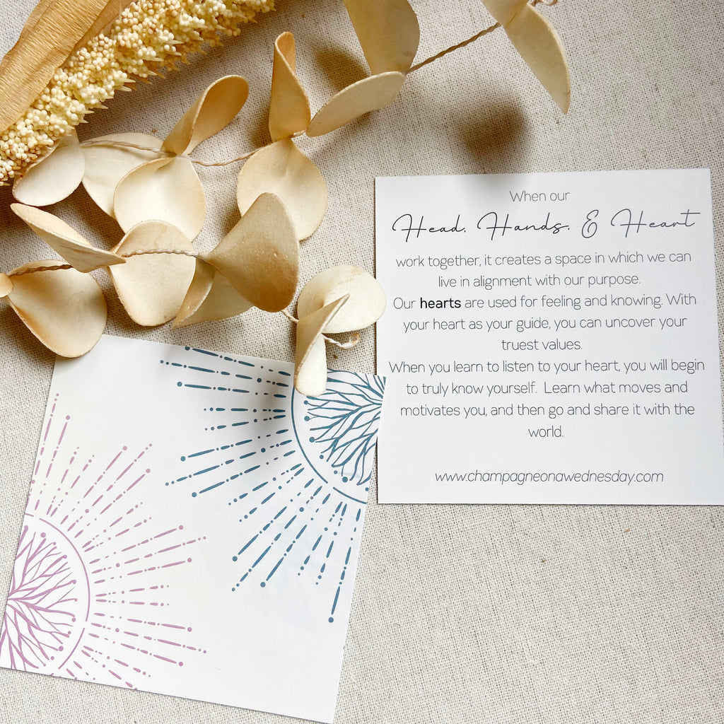 As a part of the Head, Hands, and Heart Collection, this piece is meant to remind you of the unique power of your heart to help you uncover your truest values and motivations. This necklace will be packaged with a 3.5 x 3.5 card of original artwork featuring a mandala pattern, a symbolic reminder of the desire for wholeness, along with the full story of the piece.