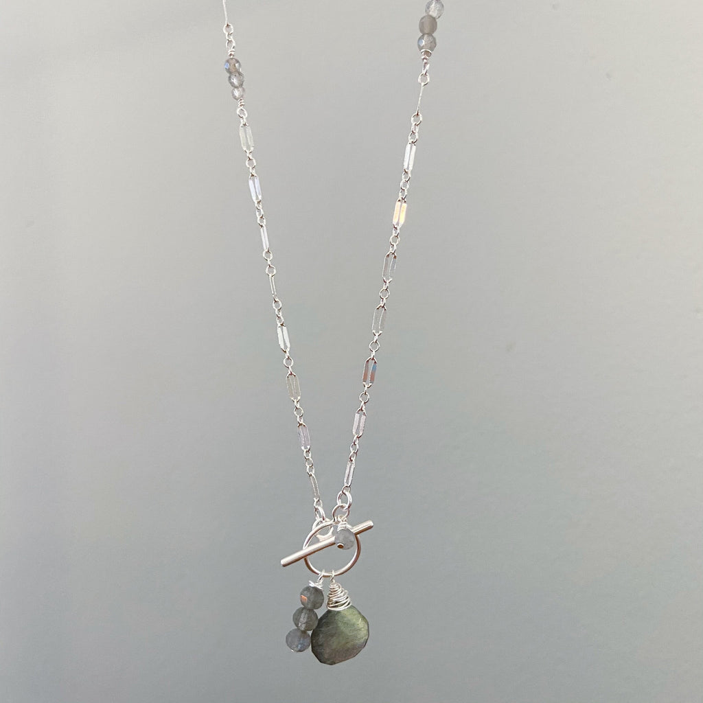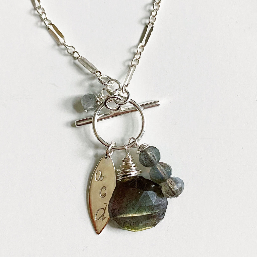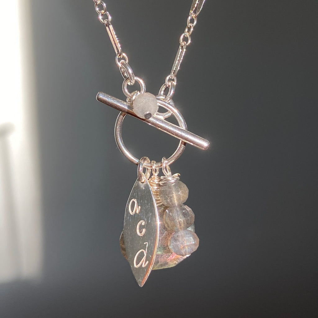 Whether you choose to personalize this necklace or not, we know that it will quickly become you go-to favorite piece of jewelry. With its delicate dapped chain and unique toggle clasp that is designed to rest at the FRONT of the necklace, this labradorite charm necklace is a show stopper.