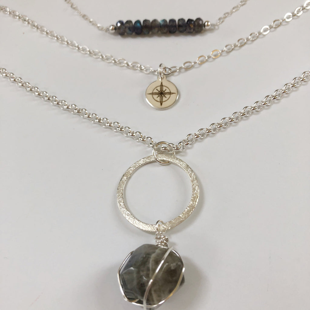Since. the original release of this piece, we have added on dozens of new designs which can be clipped in and out of this necklace- allowing for an infinite number of personalized possibilities for styling. To build your own customized 3 piece necklace set please visit THIS PAGE. But if the original variation is what you are looking for, look no further. This listing is for the original design, with a labradorite choker, a compass mid piece, and a labradorite pendant.