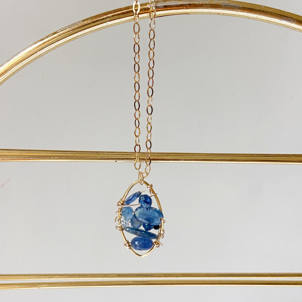 A kaleidoscope of rich varied blue kyanite are woven into the center of a gold filled marquis component to create a stunning pendant. Due to the unique nature of natural gemstones, each necklace is truly one of a kind, and the way that the stones are placed within the pendant may vary slightly from what is shown here.