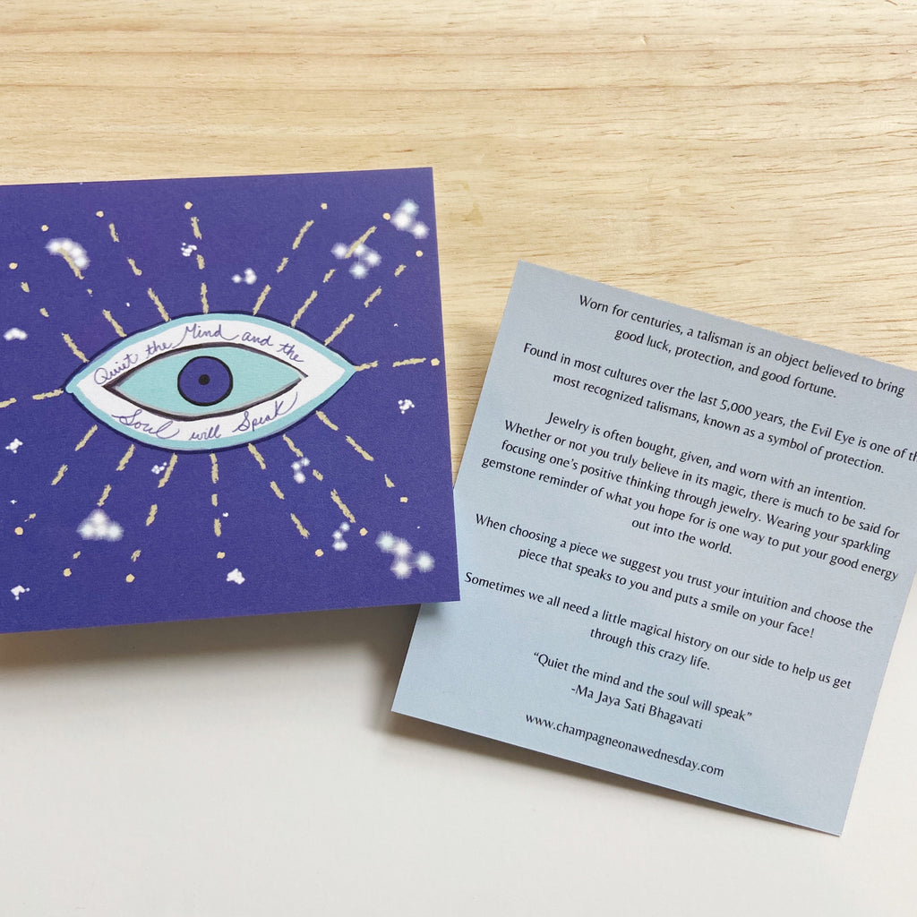 Every piece in The Evil Eye Collection features gemstones that showcase the rich colors of the Greek Islands and their surrounding waters. Many pieces also reference the shapes of popular charms and talismans that many believe can provide protection and energetic healing. This order will be packaged with a 3.5 x 3.5 card featuring the original Evil Eye Collection Artwork, which includes an inspiring message about how you can use this jewelry as a place to focus your positive energy and draw upon it throughout your day.