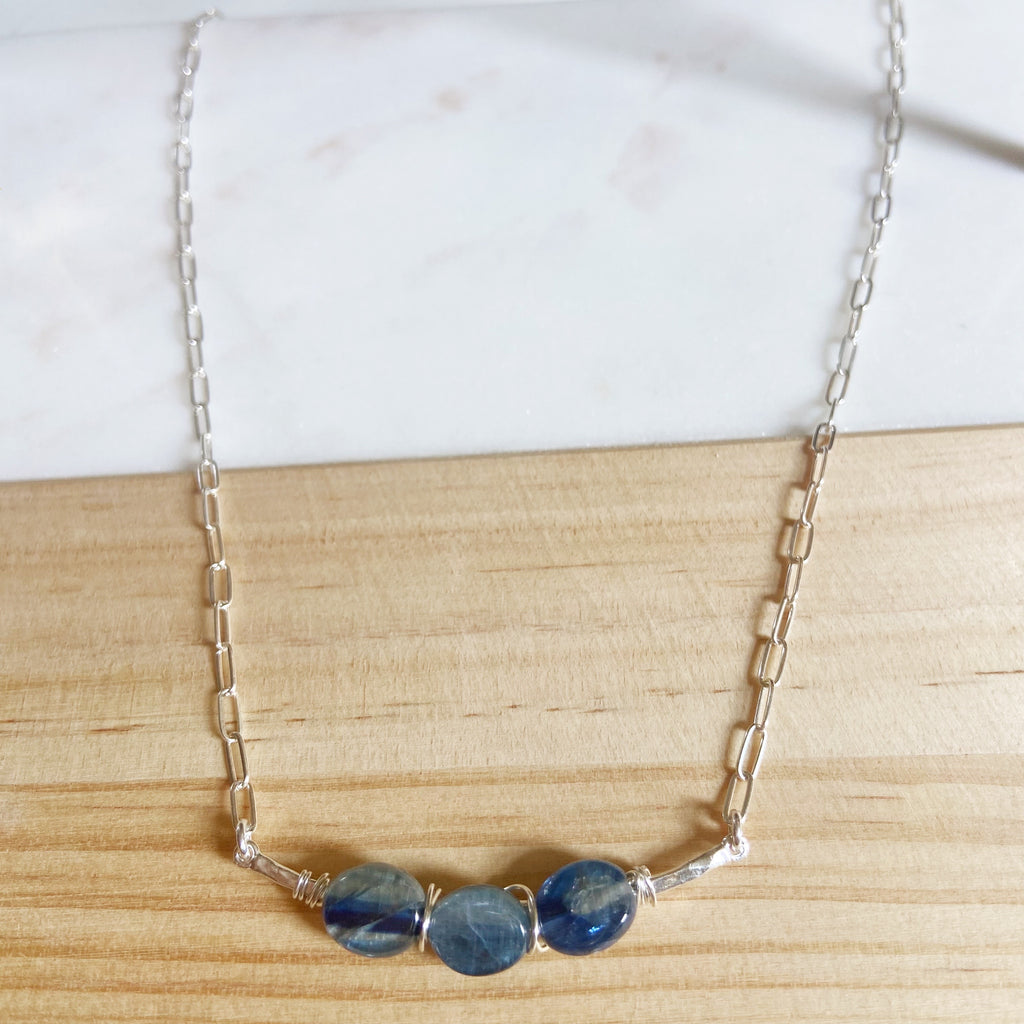 Smooth blue kyanite ovals are wire wrapped onto a hammered sterling silver bar, drawing interest to the center of this stunning sterling silver necklace.