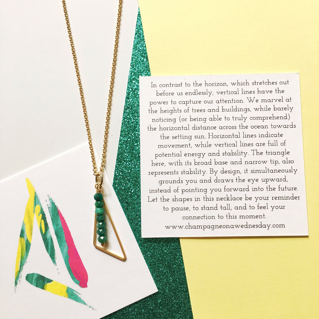 The shapes of a triangle and vertical line work together to bring home the message of the piece. The triangle here, with its broad base and narrow tip, also represents stability. By design, it simultaneously grounds you and draws the eye upward, instead of pointing you forward into the future. Let the shapes in this necklace be your reminder to pause, to stand tall, and to feel your connection to this moment.
