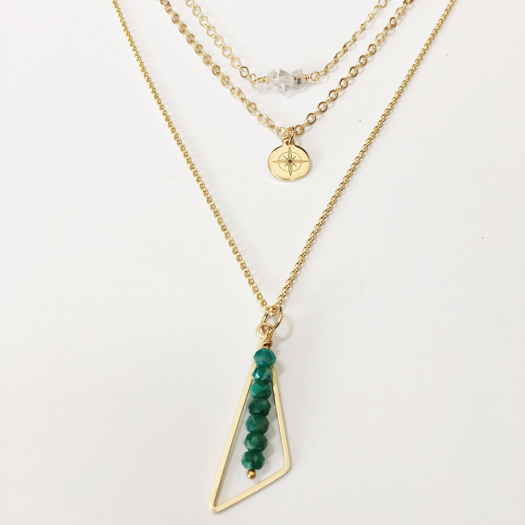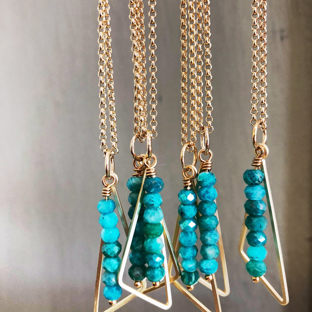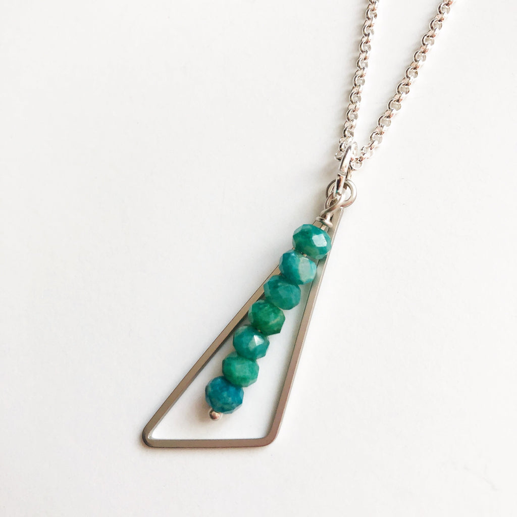 This pendant necklace features an eye catching strand of brilliant turquoise Russian Amazonite faceted roundelle gemstones, suspended within a triangle charm. Originally designed as a part of the Everyday Joy collection, this colorful necklace simultaneously grounds you and reminds you take the time to connect with what is happening all around you.