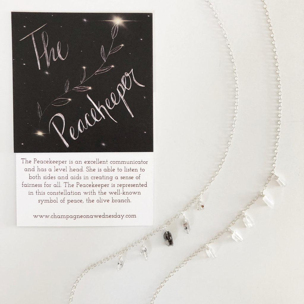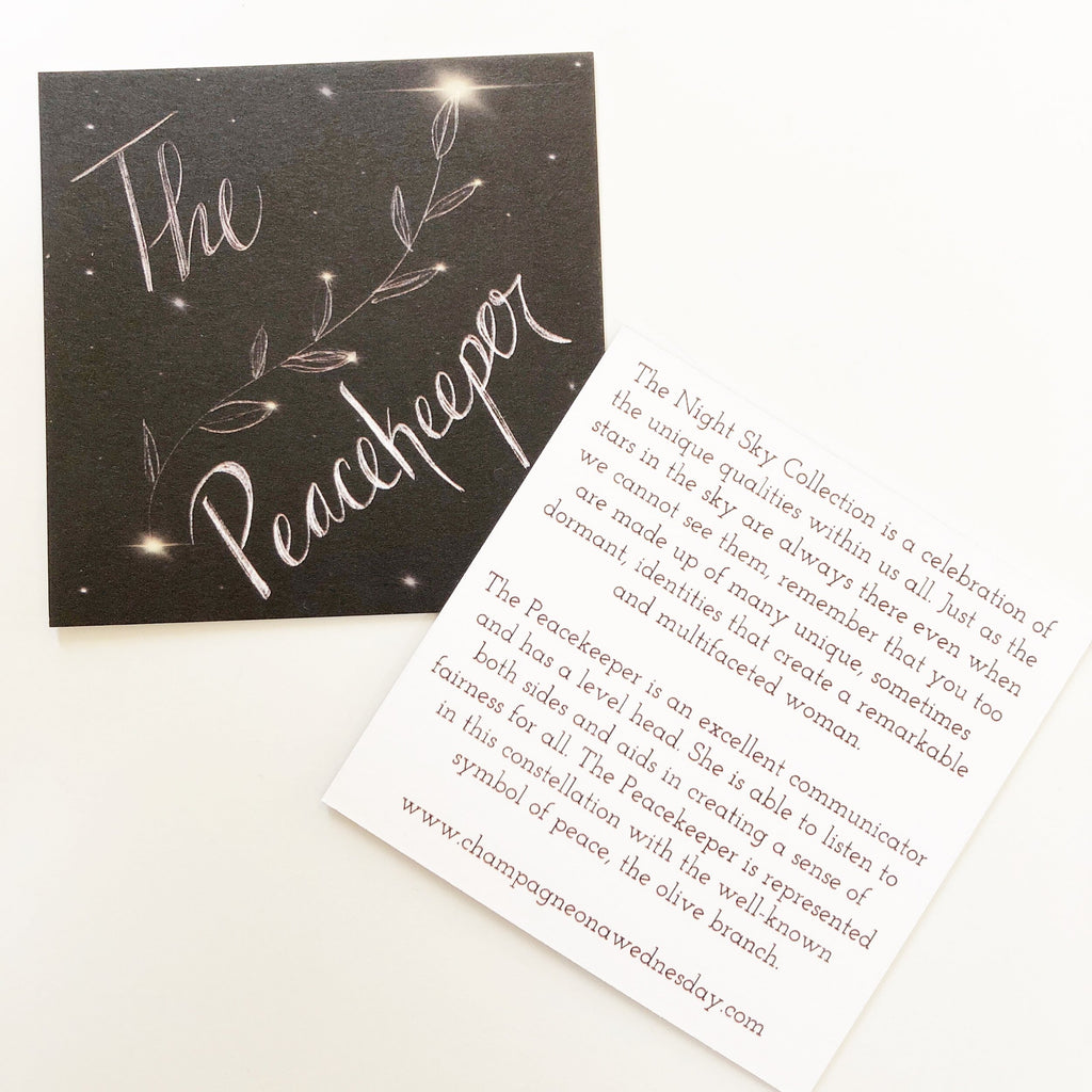 The pieces in The Night Sky collection are paired with constellations, inspired by the shapes and patterns seen within the design of the jewelry itself. This necklace is paired with the constellation of The Peacekeeper.