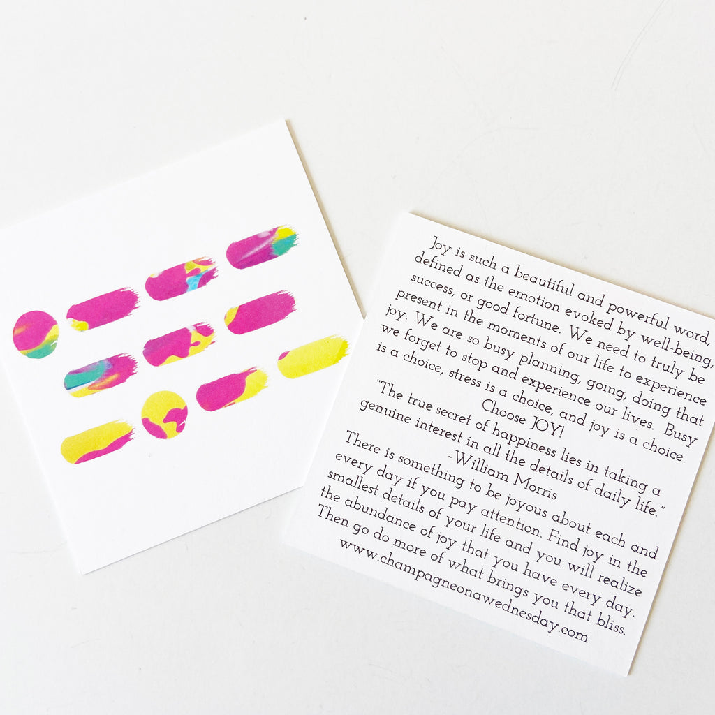 Each piece of Champagne on a Wednesday jewelry is accompanied by a 3.5 x 3.5 artwork card. The front of this card will feature original artwork specific to the theme of the collection. The back of each card will contain the full story of the collection or the individual piece. Save these cards and remember their words each time you wear your jewelry, for a dose of inspiration and motivation.
