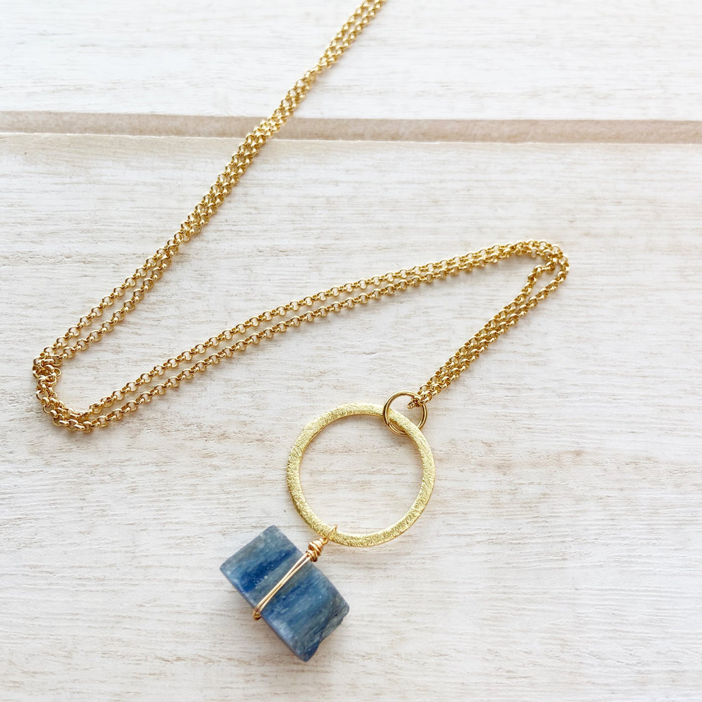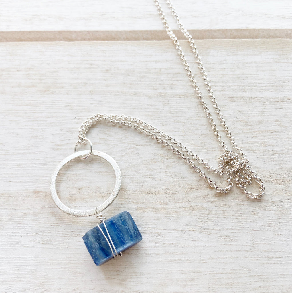 A rectangular piece of raw blue kyanite is wire wrapped beneath a brushed metal circle, creating a moveable pendant on this classic necklace.